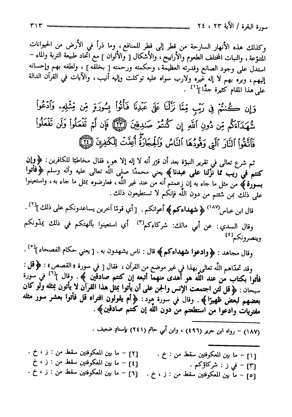 ثُمَّ شَرَعَ تَعَالَى فِي تَقْرِير النُّبُوَّة بَعْد أَنْ قَرَّرَ أَنَّهُ لَا إِلَه إِلَّا هُوَ فَقَالَ مُخَاطِبًا لِلْكَافِرِينَ " وَإِنْ كُنْتُمْ فِي رَيْبٍ مِمَّا نَزَّلْنَا عَلَى عَبْدنَا " يَعْنِي مُحَمَّدًا صَلَّى اللَّه عَلَيْهِ وَآلِهِ وَسَلَّمَ فَأْتُوا بِسُورَةٍ مِنْ مِثْل مَا جَاءَ بِهِ إِنْ زَعَمْتُمْ أَنَّهُ مِنْ عِنْد غَيْر اللَّه فَعَارِضُوهُ بِمِثْلِ مَا جَاءَ بِهِ وَاسْتَعِينُوا عَلَى ذَلِكَ بِمَنْ شِئْتُمْ مِنْ دُون اللَّه فَإِنَّكُمْ لَا تَسْتَطِيعُونَ ذَلِكَ قَالَ اِبْن عَبَّاس شُهَدَاءَكُمْ أَعْوَانكُمْ وَقَالَ السُّدِّيّ عَنْ أَبِي مَالِك شُرَكَاءَكُمْ أَيْ قَوْمًا آخَرِينَ يُسَاعِدُونَكُمْ عَلَى ذَلِكَ أَيْ اِسْتَعِينُوا بِآلِهَتِكُمْ فِي ذَلِكَ يَمُدُّونَكُمْ وَيَنْصُرُونَكُمْ وَقَالَ مُجَاهِد وَادْعُوا شُهَدَاءَكُمْ قَالَ نَاس يَشْهَدُونَ بِهِ يَعْنِي حُكَّام الْفُصَحَاء وَقَدْ تَحَدَّاهُمْ اللَّه تَعَالَى بِهَذَا فِي غَيْر مَوْضِع مِنْ الْقُرْآن فَقَالَ فِي سُورَة الْقَصَص " قُلْ فَأْتُوا بِكِتَابٍ مِنْ عِنْد اللَّه هُوَ أَهْدَى مِنْهُمَا أَتَّبِعهُ إِنْ كُنْتُمْ صَادِقِينَ " وَقَالَ فِي سُورَة سُبْحَان " قُلْ لَئِنْ اِجْتَمَعَتْ الْإِنْسُ وَالْجِنُّ عَلَى أَنْ يَأْتُوا بِمِثْلِ هَذَا الْقُرْآن لَا يَأْتُونَ بِمِثْلِهِ وَلَوْ كَانَ بَعْضُهُمْ لِبَعْضٍ ظَهِيرًا " وَقَالَ فِي سُورَة هُود " أَمْ يَقُولُونَ اِفْتَرَاهُ قُلْ فَأْتُوا بِعَشْرِ سُوَر مِثْله مُفْتَرَيَات وَادْعُوا مَنْ اِسْتَطَعْتُمْ مِنْ دُون اللَّه إِنْ كُنْتُمْ صَادِقِينَ"