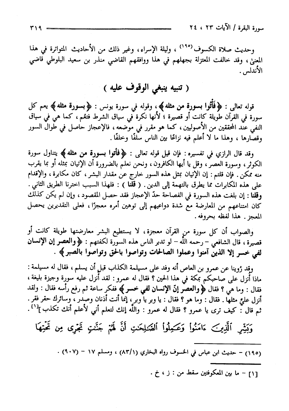 وَقَدْ قَالَ الرَّازِيّ فِي تَفْسِيره : فَإِنْ قِيلَ قَوْله تَعَالَى" فَأْتُوا بِسُورَةٍ مِنْ مِثْله " يَتَنَاوَل سُورَة الْكَوْثَر وَسُورَة الْعَصْر وَقُلْ يَا أَيّهَا الْكَافِرُونَ وَنَحْنُ نَعْلَم بِالضَّرُورَةِ أَنَّ الْإِتْيَان بِمِثْلِهِ أَوْ بِمَا يَقْرُب مِنْهُ مُمْكِن فَإِنْ قُلْتُمْ إِنَّ الْإِتْيَان بِمِثْلِ هَذِهِ السُّوَر خَارِج عَنْ مِقْدَار الْبَشَر كَانَ مُكَابَرَة وَالْإِقْدَام عَلَى هَذِهِ الْمُكَابَرَات مِمَّا يُطْرِق بِالتُّهْمَةِ إِلَى الدِّين " قُلْنَا " فَلِهَذَا السَّبَب اِخْتَرْنَا الطَّرِيق الثَّانِي وَقُلْنَا إِنْ بَلَغَتْ هَذِهِ السُّورَة فِي الْفَصَاحَة حَدّ الْإِعْجَاز فَقَدْ حَصَلَ الْمَقْصُود وَإِنْ لَمْ يَكُنْ كَذَلِكَ كَانَ اِمْتِنَاعهمْ مِنْ الْمُعَارَضَة مَعَ شِدَّة دَوَاعِيهمْ إِلَى تَوْهِين أَمْره مُعْجِزًا فَعَلَى التَّقْدِيرَيْنِ يَحْصُل الْمُعْجِز هَذَا لَفْظه بِحُرُوفِهِ وَالصَّوَاب أَنَّ كُلّ سُورَة مِنْ الْقُرْآن مُعْجِزَة لَا يَسْتَطِيع الْبَشَر مُعَارَضَتهَا طَوِيلَة كَانَتْ أَوْ قَصِيرَة قَالَ الشَّافِعِيّ رَحِمَهُ اللَّه لَوْ تَدَبَّرَ النَّاس هَذِهِ السُّورَة لَكَفَتْهُمْ " وَالْعَصْر إِنَّ الْإِنْسَان لَفِي خُسْر إِلَّا الَّذِينَ آمَنُوا وَعَمِلُوا الصَّالِحَات وَتَوَاصَوْا بِالْحَقِّ وَتَوَاصَوْا بِالصَّبْرِ " وَقَدْ رَوَيْنَا عَنْ عَمْرو بْن الْعَاص أَنَّهُ وَفَدَ عَلَى مُسَيْلِمَة الْكَذَّاب قَبْل أَنْ يُسْلِم فَقَالَ لَهُ مُسَيْلِمَة : مَاذَا أُنْزِلَ عَلَى صَاحِبكُمْ بِمَكَّة فِي هَذَا الْحِين فَقَالَ لَهُ عَمْرو لَقَدْ أُنْزِلَ عَلَيْهِ سُورَة وَجِيزَة بَلِيغَة فَقَالَ وَمَا هِيَ فَقَالَ" وَالْعَصْر إِنَّ الْإِنْسَان لَفِي خُسْر " فَفَكَّرَ سَاعَة ثُمَّ رَفَعَ رَأْسه فَقَالَ : وَلَقَدْ أُنْزِلَ عَلَيَّ مِثْلهَا فَقَالَ : وَمَا هُوَ ؟ فَقَالَ : يَا وَبْر يَا وَبْر إِنَّمَا أَنْتَ أُذُنَانِ وَصَدْر وَسَائِرك حَقْر فَقْر ثُمَّ قَالَ كَيْف تَرَى يَا عَمْرو فَقَالَ لَهُ عَمْرو وَاَللَّه إِنَّك لَتَعْلَم أَنِّي لَأَعْلَم أَنَّك تَكْذِب .