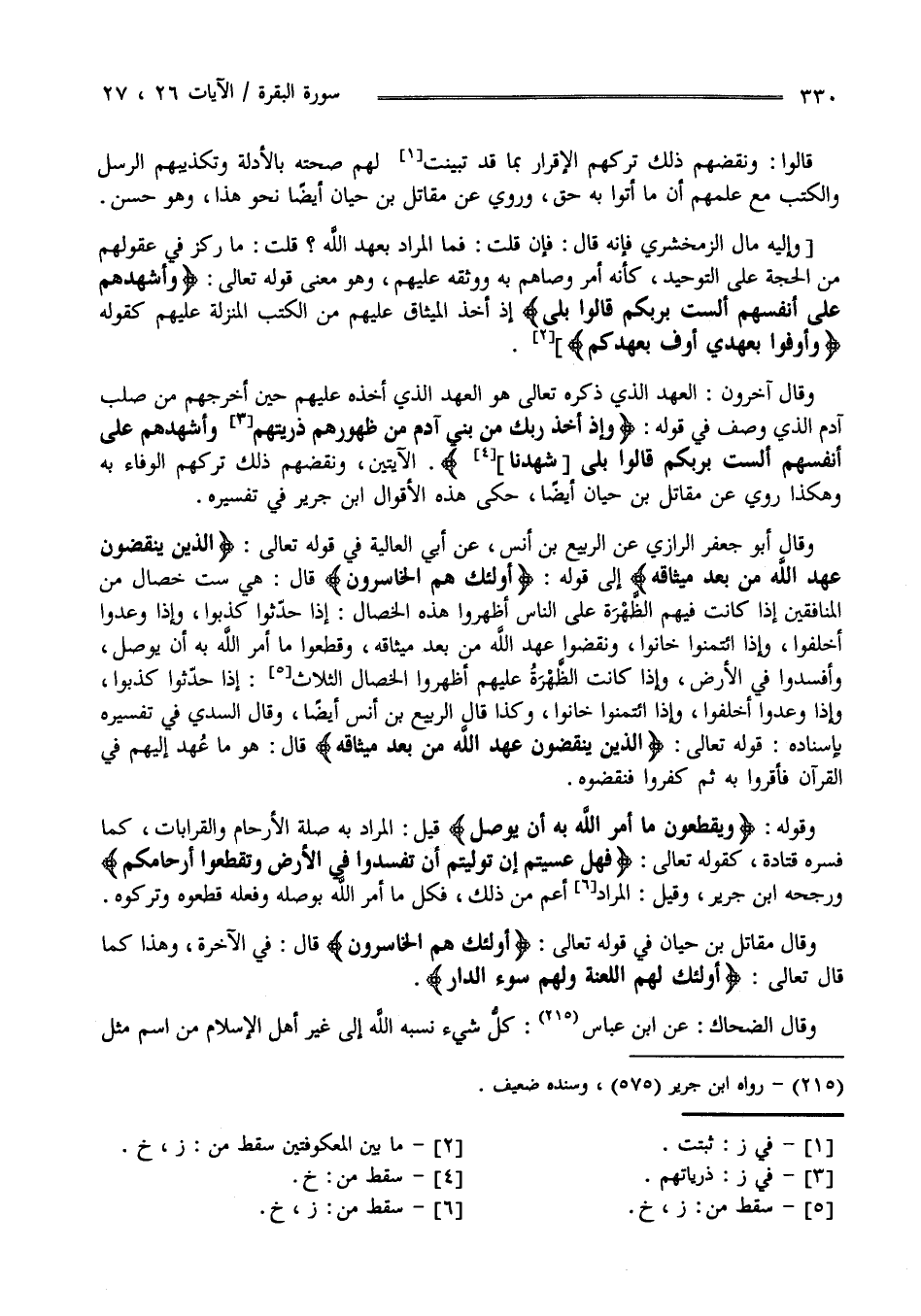 وَقَالَ أَبُو جَعْفَر الرَّازِيّ عَنْ الرَّبِيع بْن أَنَس عَنْ أَبِي الْعَالِيَة فِي قَوْله تَعَالَى " الَّذِينَ يَنْقُضُونَ عَهْد اللَّه مِنْ بَعْد مِيثَاقه - إِلَى قَوْله - أُولَئِكَ هُمْ الْخَاسِرُونَ " قَالَ هِيَ سِتّ خِصَال مِنْ الْمُنَافِقِينَ إِذَا كَانَتْ فِيهِمْ الظُّهْرَة عَلَى النَّاس أَظْهَرُوا هَذِهِ الْخِصَال : إِذَا حَدَّثُوا كَذَبُوا وَإِذَا وَعَدُوا أَخْلَفُوا وَإِذَا اُؤْتُمِنُوا خَانُوا وَنَقَضُوا عَهْد اللَّه مِنْ بَعْد مِيثَاقه وَقَطَعُوا مَا أَمَرَ اللَّه بِهِ أَنْ يُوصَل وَأَفْسَدُوا فِي الْأَرْض وَإِذَا كَانَتْ الظُّهْرَة عَلَيْهِمْ أَظْهَرُوا الْخِصَال الثَّلَاث إِذَا حَدَّثُوا كَذَبُوا وَإِذَا وَعَدُوا أَخْلَفُوا وَإِذَا اُؤْتُمِنُوا خَانُوا .