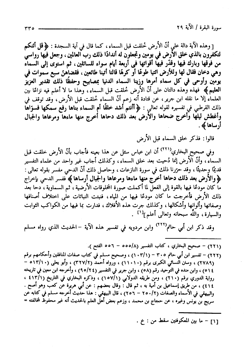 وَفِي صَحِيح الْبُخَارِيّ أَنَّ اِبْن عَبَّاس سُئِلَ عَنْ هَذَا بِعَيْنِهِ فَأَجَابَ بِأَنَّ الْأَرْض خُلِقَتْ قَبْل السَّمَاء وَأَنَّ الْأَرْض إِنَّمَا دُحِيَتْ بَعْد خَلْق السَّمَاء وَكَذَلِكَ أَجَابَ غَيْر وَاحِد مِنْ عُلَمَاء التَّفْسِير قَدِيمًا وَحَدِيثًا وَقَدْ حَرَّرْنَا ذَلِكَ فِي سُورَة النَّازِعَات وَحَاصِل ذَلِكَ أَنَّ الدَّحْي مُفَسَّر بِقَوْلِهِ تَعَالَى " وَالْأَرْض بَعْد ذَلِكَ دَحَاهَا أَخْرَجَ مِنْهَا مَاءَهَا وَمَرْعَاهَا وَالْجِبَال أَرْسَاهَا " فَفَسَّرَ الدَّحْي بِإِخْرَاجِ مَا كَانَ مُودَعًا فِيهَا بِالْقُوَّةِ إِلَى الْفِعْل لَمَّا أُكْمِلَتْ سُورَة الْمَخْلُوقَات الْأَرْضِيَّة ثُمَّ السَّمَاوِيَّة دَحَى بَعْد ذَلِكَ الْأَرْض فَأَخْرَجَتْ مَا كَانَ مُودَعًا فِيهَا مِنْ الْمِيَاه فَنَبَتَتْ النَّبَاتَات عَلَى اِخْتِلَاف أَصْنَافهَا وَصِفَاتهَا وَأَلْوَانهَا وَأَشْكَالهَا وَكَذَلِكَ جَرَتْ هَذِهِ الْأَفْلَاك فَدَارَتْ بِمَا فِيهَا مِنْ الْكَوَاكِب الثَّوَابِت وَالسَّيَّارَة وَاَللَّه سُبْحَانه وَتَعَالَى أَعْلَم.