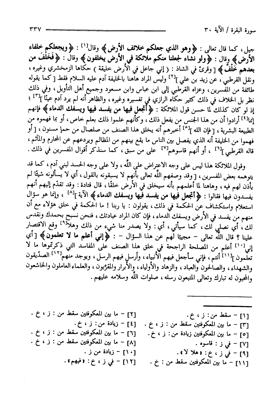 جِيل كَمَا قَالَ تَعَالَى " هُوَ الَّذِي جَعَلَكُمْ خَلَائِف الْأَرْض " وَقَالَ " وَيَجْعَلكُمْ خُلَفَاء الْأَرْض" وَقَالَ " وَلَوْ نَشَاء لَجَعَلْنَا مِنْكُمْ مَلَائِكَة فِي الْأَرْض يَخْلُفُونَ " وَقَالَ " فَخَلَفَ مِنْ بَعْدهمْ خَلْفٌ " وَقُرِئَ فِي الشَّاذ " إِنِّي جَاعِل فِي الْأَرْض خَلِيفَة " حَكَاهَا الزَّمَخْشَرِيّ وَغَيْره وَنَقَلَ الْقُرْطُبِيّ عَنْ زَيْد بْن عَلِيّ وَلَيْسَ الْمُرَاد هَاهُنَا بِالْخَلِيفَةِ آدَم عَلَيْهِ السَّلَام فَقَطْ كَمَا يَقُولهُ طَائِفَة مِنْ الْمُفَسِّرِينَ وَعَزَاهُ الْقُرْطُبِيّ إِلَى اِبْن عَبَّاس وَابْن مَسْعُود وَجَمِيع أَهْل التَّأْوِيل وَفِي ذَلِكَ نَظَرٌ بَلَّ الْخِلَاف فِي ذَلِكَ كَثِير حَكَاهُ الرَّازِيّ فِي تَفْسِيره وَغَيْره وَالظَّاهِر أَنَّهُ لَمْ يُرِدْ آدَم عَيْنًا إِذْ لَوْ كَانَ ذَلِكَ لَمَا حَسُنَ قَوْل الْمَلَائِكَة " أَتَجْعَلُ فِيهَا مَنْ يُفْسِدُ فِيهَا وَيَسْفِك الدِّمَاء " فَإِنَّهُمْ أَرَادُوا أَنَّ مِنْ هَذَا الْجِنْس مَنْ يَفْعَل ذَلِكَ وَكَأَنَّهُمْ عَلِمُوا ذَلِكَ بِعِلْمٍ خَاصّ أَوْ بِمَا فَهِمُوهُ مِنْ الطَّبِيعَة الْبَشَرِيَّة فَإِنَّهُ أَخْبَرَهُمْ أَنَّهُ يَخْلُق هَذَا الصِّنْف مِنْ صَلْصَال مِنْ حَمَإٍ مَسْنُون أَوْ فَهِمُوا مِنْ الْخَلِيفَة أَنَّهُ الَّذِي يَفْصِل بَيْن النَّاس مَا يَقَع بَيْنهمْ مِنْ الْمَظَالِم وَيَرْدَعهُمْ عَنْ الْمَحَارِم وَالْمَآثِم قَالَهُ الْقُرْطُبِيّ أَوْ أَنَّهُمْ قَاسُوهُمْ عَلَى مَنْ سَبَقَ كَمَا سَنَذْكُرُ أَقْوَال الْمُفَسِّرِينَ فِي ذَلِكَ وَقَوْل الْمَلَائِكَة هَذَا لَيْسَ عَلَى وَجْه الِاعْتِرَاض عَلَى اللَّه وَلَا عَلَى وَجْه الْحَسَد لِبَنِي آدَم كَمَا قَدْ يَتَوَهَّمهُ بَعْض الْمُفَسِّرِينَ وَقَدْ وَصَفَهُمْ اللَّه تَعَالَى بِأَنَّهُمْ لَا يَسْبِقُونَهُ بِالْقَوْلِ أَيْ لَا يَسْأَلُونَهُ شَيْئًا لَمْ يَأْذَن لَهُمْ فِيهِ وَهَاهُنَا لَمَّا أَعْلَمَهُمْ بِأَنَّهُ سَيَخْلُقُ فِي الْأَرْض خَلْقًا قَالَ قَتَادَة وَقَدْ تَقَدَّمَ إِلَيْهِمْ أَنَّهُمْ يُفْسِدُونَ فِيهَا فَقَالُوا " أَتَجْعَلُ فِيهَا مَنْ يُفْسِد فِيهَا وَيَسْفِك الدِّمَاء" الْآيَة وَإِنَّمَا هُوَ سُؤَال اِسْتِعْلَام وَاسْتِكْشَاف عَنْ الْحِكْمَة فِي ذَلِكَ يَقُولُونَ يَا رَبّنَا مَا الْحِكْمَة فِي خَلْق هَؤُلَاءِ مَعَ أَنَّ مِنْهُمْ مَنْ يُفْسِد فِي الْأَرْض وَيَسْفِك الدِّمَاء فَإِنْ كَانَ الْمُرَاد عِبَادَتك فَنَحْنُ نُسَبِّح بِحَمْدِك وَنُقَدِّس لَك أَيْ نُصَلِّي لَك كَمَا سَيَأْتِي .