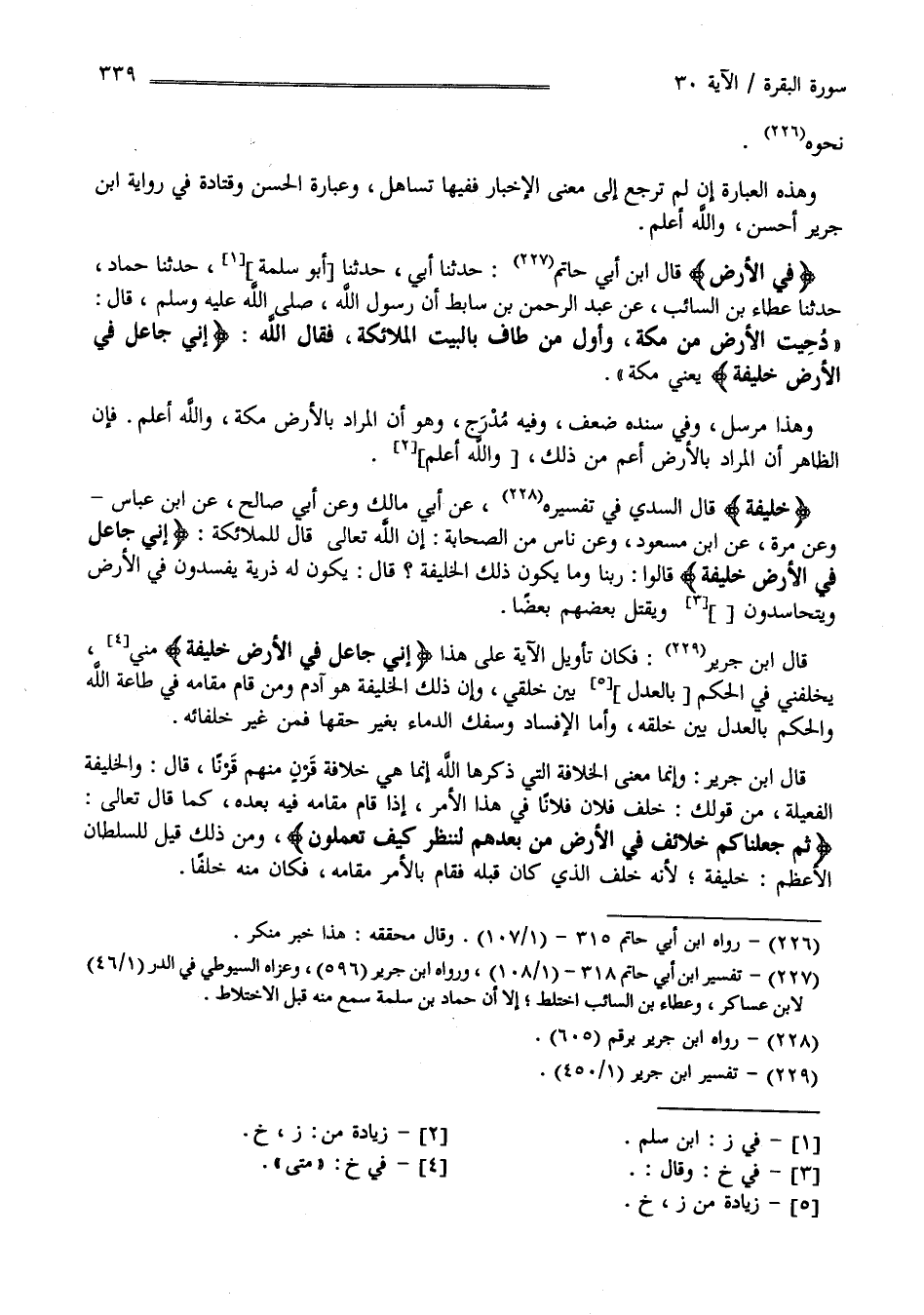 نَحْوه وَهَذِهِ الْعِبَارَة إِنْ لَمْ تَرْجِع إِلَى مَعْنَى الْإِخْبَار فَفِيهَا تَسَاهُل وَعِبَارَة الْحَسَن وَقَتَادَة فِي رِوَايَة اِبْن جَرِير أَحْسَن وَاَللَّه أَعْلَم فِي الْأَرْض قَالَ اِبْن أَبِي حَاتِم : حَدَّثَنَا أَبِي حَدَّثَنَا أَبُو سَلَمَة حَدَّثَنَا حَمَّاد بْن عَطَاء بْن السَّائِب عَنْ عَبْد الرَّحْمَن بْن سَابِط أَنَّ رَسُول اللَّه صَلَّى اللَّه عَلَيْهِ وَسَلَّمَ قَالَ " دُحِيَتْ الْأَرْض مِنْ مَكَّة وَأَوَّل مَنْ طَافَ بِالْبَيْتِ الْمَلَائِكَة فَقَالَ اللَّه إِنِّي جَاعِل فِي الْأَرْض خَلِيفَة يَعْنِي مَكَّة " وَهَذَا مُرْسَل وَفِي سَنَده ضَعْف وَفِيهِ مُدْرَج وَهُوَ أَنَّ الْمُرَاد بِالْأَرْضِ مَكَّة وَاَللَّه أَعْلَم فَإِنَّ الظَّاهِر أَنَّ الْمُرَاد بِالْأَرْضِ أَعَمّ مِنْ ذَلِكَ خَلِيفَة قَالَ السُّدِّيّ فِي تَفْسِيره عَنْ أَبِي مَالِك وَعَنْ أَبِي صَالِح عَنْ اِبْن عَبَّاس وَعَنْ مُرَّة عَنْ اِبْن مَسْعُود وَعَنْ نَاس مِنْ الصَّحَابَة إِنَّ اللَّه تَعَالَى قَالَ لِلْمَلَائِكَةِ إِنِّي جَاعِل فِي الْأَرْض خَلِيفَة .