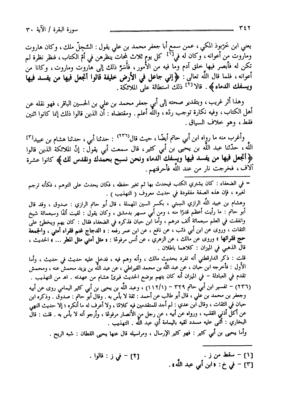 وَهَذَا أَثَر غَرِيب وَبِتَقْدِيرِ صِحَّته إِلَى أَبِي جَعْفَر مُحَمَّد بْن عَلِيّ بْن الْحَسَن الْبَاقِر فَهُوَ نَقَلَهُ عَنْ أَهْل الْكِتَاب وَفِيهِ نَكَارَة تُوجِب رَدَّهُ وَاَللَّه أَعْلَم وَمُقْتَضَاهُ أَنَّ الَّذِينَ قَالُوا ذَلِكَ إِنَّمَا كَانُوا اِثْنَيْنِ فَقَطْ وَهُوَ خِلَاف السِّيَاق وَأَغْرَب مِنْهُ مَا رَوَاهُ اِبْن أَبِي حَاتِم أَيْضًا بِحَيْثُ قَالَ : حَدَّثَنَا أَبِي حَدَّثَنَا هِشَام بْن أَبِي عُبَيْد اللَّه حَدَّثَنَا عَبْد اللَّه بْن يَحْيَى بْن أَبِي كَثِير قَالَ : سَمِعْت أَبِي يَقُول إِنَّ الْمَلَائِكَة الَّذِينَ قَالُوا " أَتَجْعَلُ فِيهَا مَنْ يُفْسِد فِيهَا وَيَسْفِك الدِّمَاء وَنَحْنُ نُسَبِّح بِحَمْدِك وَنُقَدِّس لَك " كَانُوا عَشْرَة آلَاف فَخَرَجَتْ نَار مِنْ عِنْد اللَّه فَأَحْرَقَتْهُمْ