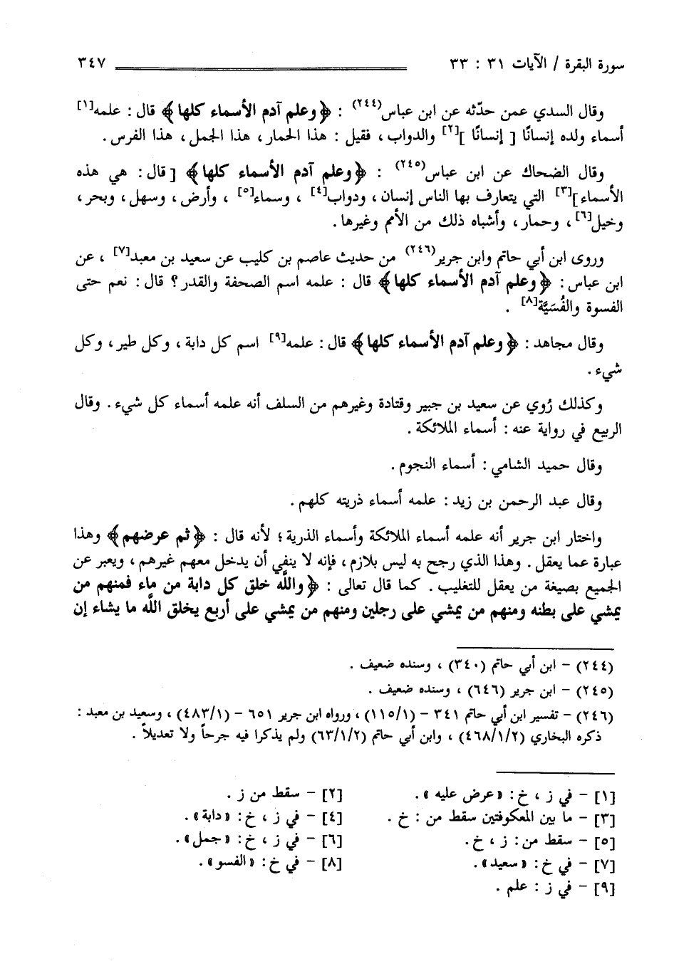 َالَ السُّدِّيّ عَمَّنْ حَدَّثَهُ عَنْ اِبْن عَبَّاس " وَعَلَّمَ آدَم الْأَسْمَاء كُلّهَا " قَالَ عَلَّمَهُ أَسْمَاء وَلَده إِنْسَانًا إِنْسَانًا وَالدَّوَابّ فَقِيلَ هَذَا الْحِمَار هَذَا الْجَمَل هَذَا الْفَرَس وَقَالَ الضَّحَّاك عَنْ اِبْن عَبَّاس " وَعَلَّمَ آدَم الْأَسْمَاء كُلّهَا " قَالَ هِيَ هَذِهِ الْأَسْمَاء الَّتِي يَتَعَارَف بِهَا النَّاس إِنْسَان وَدَوَابّ وَسَمَاء وَأَرْض وَسَهْل وَبَحْر وَخَيْل وَحِمَار وَأَشْبَاه ذَلِكَ مِنْ الْأُمَم وَغَيْرهَا وَرَوَى اِبْن أَبِي حَاتِم وَابْن جَرِير مِنْ حَدِيث عَاصِم بْن كُلَيْب عَنْ سَعِيد بْن مَعْبَد عَنْ اِبْن عَبَّاس " وَعَلَّمَ آدَم الْأَسْمَاء كُلّهَا " قَالَ عَلَّمَهُ اِسْم الصَّحْفَة وَالْقِدْر قَالَ نَعَمْ حَتَّى الْفَسْوَة وَالْفُسَيَّة وَقَالَ مُجَاهِد " وَعَلَّمَ آدَم الْأَسْمَاء كُلّهَا " قَالَ عَلَّمَهُ اِسْم كُلّ دَابَّة وَكُلّ طَيْر وَكُلّ شَيْء وَكَذَلِكَ رُوِيَ عَنْ سَعِيد بْن جُبَيْر وَقَتَادَة وَغَيْرهمْ مِنْ السَّلَف أَنَّهُ عَلَّمَهُ أَسْمَاء كُلّ شَيْء وَقَالَ الرَّبِيع فِي رِوَايَة عَنْهُ أَسْمَاء الْمَلَائِكَة .