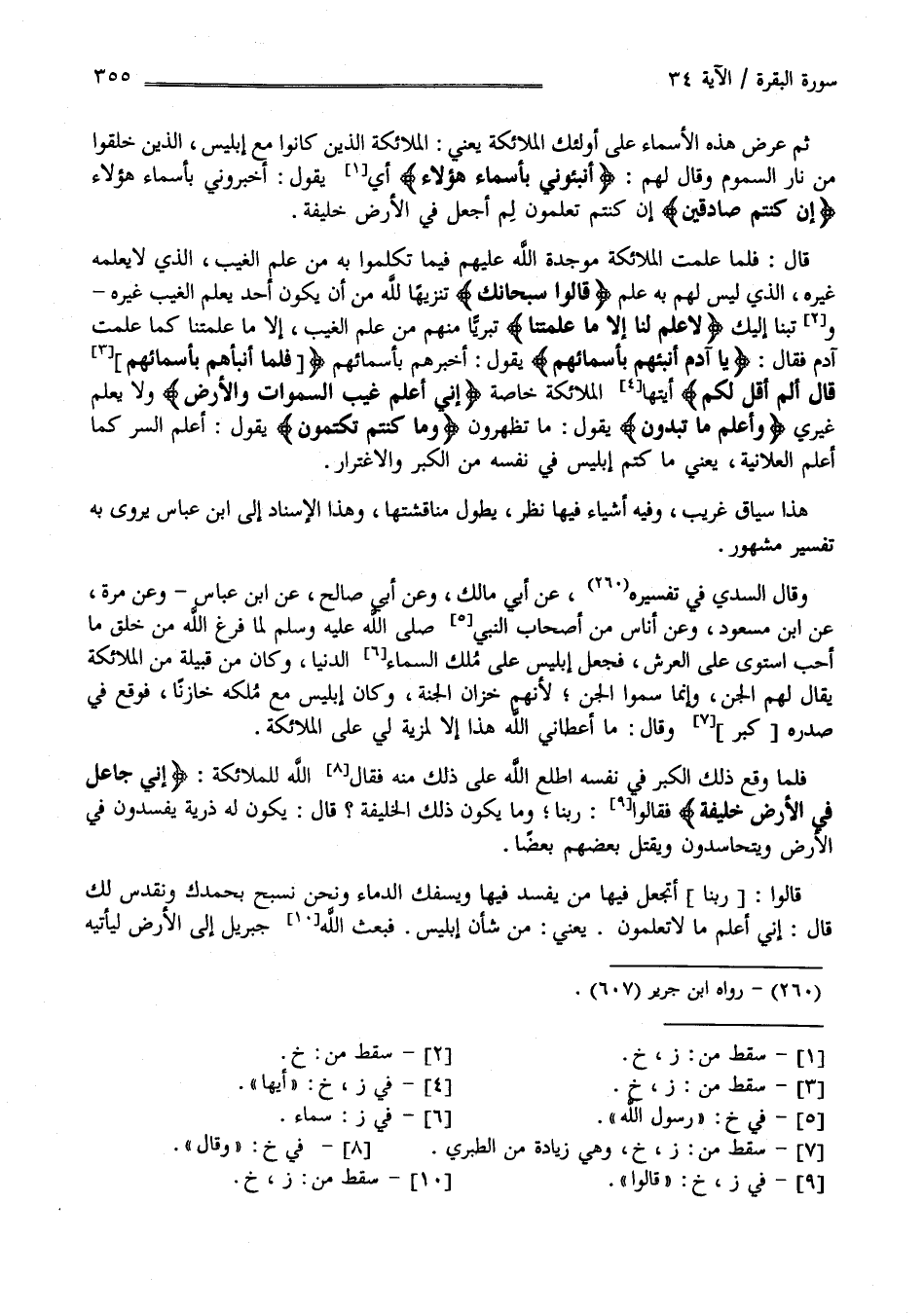 ثُمَّ عَرَضَ هَذِهِ الْأَسْمَاء عَلَى أُولَئِكَ الْمَلَائِكَة يَعْنِي الْمَلَائِكَة الَّذِينَ كَانُوا مَعَ إِبْلِيس الَّذِينَ خُلِقُوا مِنْ نَار السَّمُوم وَقَالَ لَهُمْ " أَنْبِئُونِي بِأَسْمَاءِ هَؤُلَاءِ" أَيْ يَقُول أَخْبِرُونِي بِأَسْمَاءِ هَؤُلَاءِ " إِنْ كُنْتُمْ صَادِقِينَ" إِنْ كُنْتُمْ تَعْلَمُونَ لِمَ أَجْعَل فِي الْأَرْض خَلِيفَة قَالَ : فَلَمَّا عَلِمْت الْمَلَائِكَة مَوْجِدَة اللَّه عَلَيْهِمْ فِيمَا تَكَلَّمُوا بِهِ مِنْ عِلْم الْغَيْب الَّذِي لَا يَعْلَمهُ غَيْره الَّذِي لَيْسَ لَهُمْ بِهِ عِلْم " قَالُوا سُبْحَانك " تَنْزِيهًا لِلَّهِ مِنْ أَنْ يَكُون أَحَد يَعْلَم الْغَيْب غَيْره تُبْنَا إِلَيْك" لَا عِلْم لَنَا إِلَّا مَا عَلَّمْتنَا " تَبَرِّيًا مِنْهُمْ مِنْ عِلْم الْغَيْب إِلَّا مَا عَلَّمْتنَا كَمَا عَلَّمْت آدَم فَقَالَ" يَا آدَم أَنْبِئْهُمْ بِأَسْمَائِهِمْ " يَقُول " أَخْبِرْهُمْ بِأَسْمَائِهِمْ فَلَمَّا أَنْبَأَهُمْ بِأَسْمَائِهِمْ " قَالَ " أَلَمْ أَقُلْ لَكُمْ" أَيَّتهَا الْمَلَائِكَة خَاصَّة " إِنِّي أَعْلَم غَيْب السَّمَاوَات وَالْأَرْض " وَلَا يَعْلَم غَيْرِي " وَأَعْلَم مَا تُبْدُونَ " يَقُول مَا تُظْهِرُونَ " وَمَا كُنْتُمْ تَكْتُمُونَ " يَقُول أَعْلَم السِّرّ كَمَا أَعْلَم الْعَلَانِيَة يَعْنِي مَا كَتَمَ إِبْلِيس فِي نَفْسه مِنْ الْكِبْر وَالِاغْتِرَار هَذَا سِيَاق غَرِيب وَفِيهِ أَشْيَاء فِيهَا نَظَر يَطُول مُنَاقَشَتهَا وَهَذَا الْإِسْنَاد إِلَى اِبْن عَبَّاس يُرْوَى بِهِ تَفْسِير مَشْهُور وَقَالَ السُّدِّيّ فِي تَفْسِيره عَنْ أَبِي مَالِك وَعَنْ أَبِي صَالِح عَنْ اِبْن عَبَّاس وَعَنْ مُرَّة عَنْ اِبْن مَسْعُود وَعَنْ أُنَاس مِنْ أَصْحَاب النَّبِيّ صَلَّى اللَّه عَلَيْهِ وَسَلَّمَ لَمَّا فَرَغَ اللَّه مِنْ خَلْق مَا أَحَبَّ اِسْتَوَى عَلَى الْعَرْش فَجَعَلَ إِبْلِيس عَلَى مُلْك السَّمَاء الدُّنْيَا وَكَانَ مِنْ قَبِيلَة مِنْ الْمَلَائِكَة يُقَال لَهُمْ الْجِنّ
