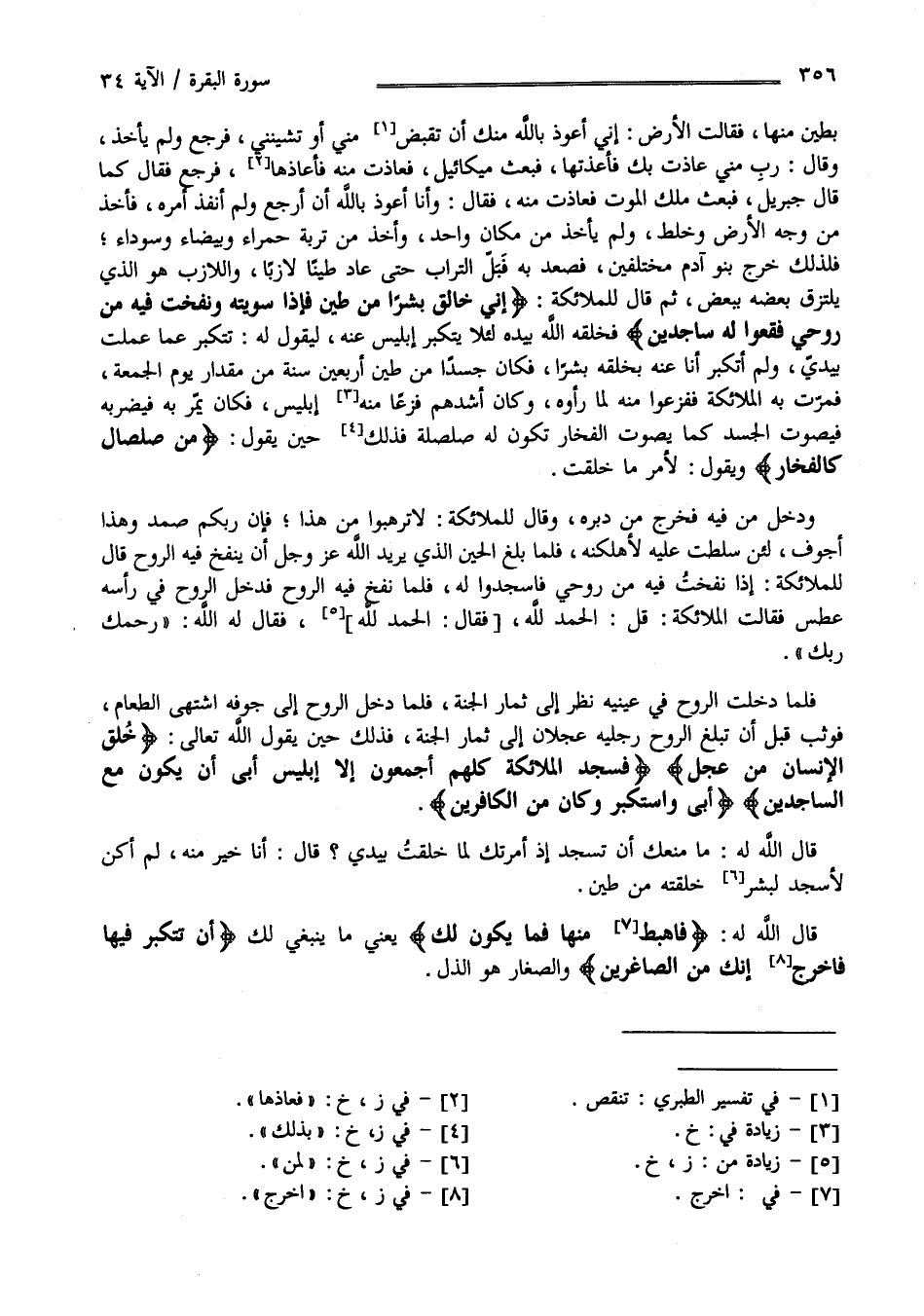 بِطِينٍ مِنْهَا فَقَالَتْ الْأَرْض إِنِّي أَعُوذ بِاَللَّهِ مِنْك أَنْ تُنْقِص مِنِّي أَوْ تُشِينَنِي فَرَجَعَ وَلَمْ يَأْخُذ وَقَالَ يَا رَبّ إِنَّهَا عَاذَتْ بِك فَأَعَذْتهَا فَبَعَثَ مِيكَائِيل فَعَاذَتْ مِنْهُ فَعَاذَهَا فَرَجَعَ فَقَالَ كَمَا قَالَ جِبْرِيل فَبَعَثَ مَلَك الْمَوْت فَعَاذَتْ مِنْهُ فَقَالَ : وَأَنَا أَعُوذ بِاَللَّهِ أَنْ أَرْجِع وَلَمْ أُنَفِّذ أَمْره فَأَخَذَ مِنْ وَجْه الْأَرْض وَخَلَطَ وَلَمْ يَأْخُذ مِنْ مَكَان وَاحِد وَأَخَذَ مِنْ تُرْبَة حَمْرَاء وَبَيْضَاء وَسَوْدَاء فَلِذَلِكَ خَرَجَ بَنُو آدَم مُخْتَلِفِينَ فَصَعِدَ بِهِ قَبْل التُّرَاب حَتَّى عَادَ طِينًا لَازِبًا وَاللَّازِب هُوَ الَّذِي يَلْتَزِق بَعْضه بِبَعْضٍ ثُمَّ قَالَ لِلْمَلَائِكَةِ " إِنِّي خَالِق بَشَرًا مِنْ طِين فَإِذَا سَوَّيْتُهُ وَنَفَخْت فِيهِ مِنْ رُوحِي فَقَعُوا لَهُ سَاجِدِينَ " فَخَلَقَهُ اللَّه بِيَدِهِ لِئَلَّا يَتَكَبَّر إِبْلِيس عَنْهُ لِيَقُولَ لَهُ تَتَكَبَّر عَمَّا عَمِلْت بِيَدَيَّ وَلَمْ أَتَكَبَّر أَنَا عَنْهُ بِخَلْقِهِ بَشَرًا فَكَانَ جَسَدًا مِنْ طِين أَرْبَعِينَ سَنَة مِنْ مِقْدَار يَوْم الْجُمْعَة فَمَرَّتْ بِهِ الْمَلَائِكَة فَفَزِعُوا مِنْهُ لَمَّا رَأَوْهُ فَكَانَ أَشَدّهمْ فَزَعًا مِنْهُ إِبْلِيس فَكَانَ يَمُرّ بِهِ فَيَضْرِبهُ فَيُصَوِّت الْجَسَد كَمَا يُصَوِّت الْفَخَّار يَكُون لَهُ صَلْصَلَة فَذَلِكَ حِين يَقُول " مِنْ صَلْصَال كَالْفَخَّارِ " وَيَقُول لِأَمْرٍ مَا خُلِقْت وَدَخَلَ مِنْ فِيهِ فَخَرَجَ مِنْ دُبُره وَقَالَ لِلْمَلَائِكَةِ لَا تَرْهَبُوا مِنْ هَذَا فَإِنَّ رَبّكُمْ صَمَدٌ وَهَذَا أَجْوَف لَئِنْ سُلِّطْت عَلَيْهِ لَأُهْلِكَنَّهُ فَلَمَّا بَلَغَ الْحِين الَّذِي يُرِيد اللَّه عَزَّ وَجَلَّ أَنْ يَنْفُخ فِيهِ الرُّوح قَالَ لِلْمَلَائِكَةِ إِذَا نَفَخْت فِيهِ مِنْ رُوحِي فَاسْجُدُوا لَهُ فَلَمَّا نَفَخَ فِيهِ الرُّوح فَدَخَلَ الرُّوح فِي رَأْسه عَطَسَ فَقَالَتْ الْمَلَائِكَة قُلْ الْحَمْد لِلَّهِ فَقَالَ فَقَالَ لَهُ اللَّه " يَرْحَمك اللَّه" فَلَمَّا دَخَلَتْ الرُّوح فِي عَيْنَيْهِ نَظَرَ إِلَى ثِمَار الْجَنَّة فَلَمَّا دَخَلَ الرُّوح إِلَى جَوْفه اِشْتَهَى الطَّعَام فَوَثَبَ قَبْل أَنْ تَبْلُغ الرُّوح رِجْلَيْهِ عَجْلَان إِلَى ثِمَار الْجَنَّة فَذَلِكَ حِين يَقُول اللَّه تَعَالَى " خُلِقَ الْإِنْسَانُ مِنْ عَجَل" فَسَجَدَ الْمَلَائِكَة كُلّهمْ أَجْمَعُونَ إِلَّا إِبْلِيس أَبَى أَنْ يَكُون مَعَ السَّاجِدِينَ أَبَى وَاسْتَكْبَرَ وَكَانَ مِنْ الْكَافِرِينَ قَالَ اللَّه لَهُ مَا مَنَعَك أَنْ تَسْجُد إِذْ أَمَرْتُك لِمَا خَلَقْت بِيَدَيَّ ؟ قَالَ أَنَا خَيْر مِنْهُ لَمْ أَكُنْ لِأَسْجُد لِبَشَرٍ خَلَقْته مِنْ طِين قَالَ اللَّه لَهُ " اُخْرُجْ مِنْهَا فَمَا يَكُون لَك " يَعْنِي مَا يَنْبَغِي لَك " أَنْ تَتَكَبَّر فِيهَا فَاخْرُجْ إِنَّك مِنْ الصَّاغِرِينَ " وَالصِّغَار هُوَ الذُّلّ
