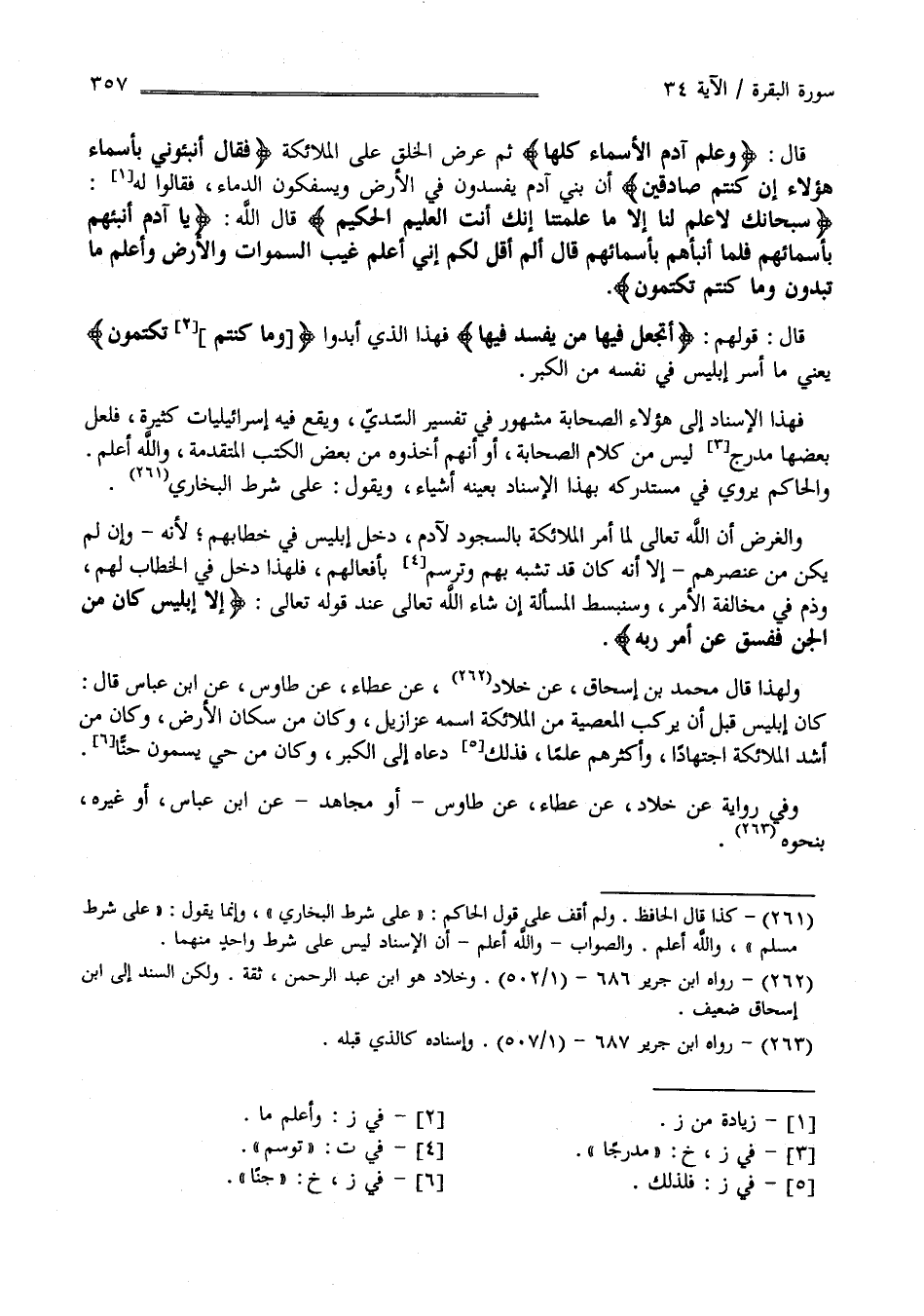 بِأَسْمَائِهِمْ قَالَ أَلَمْ أَقُلْ لَكُمْ إِنِّي أَعْلَم غَيْب السَّمَاوَات وَالْأَرْض وَأَعْلَم مَا تُبْدُونَ وَمَا كُنْتُمْ تَكْتُمُونَ قَالَ : قَوْلهمْ " أَتَجْعَلُ فِيهَا مَنْ يُفْسِد فِيهَا " فَهَذَا الَّذِي أَبْدُوا " وَأَعْلَم مَا كُنْتُمْ تَكْتُمُونَ" يَعْنِي مَا أَسَرَّ إِبْلِيس فِي نَفْسه مِنْ الْكِبْر فَهَذَا الْإِسْنَاد إِلَى هَؤُلَاءِ الصَّحَابَة مَشْهُور فِي تَفْسِير السُّدِّيّ وَيَقَع فِيهِ إِسْرَائِيلِيَّات كَثِيرَة فَلَعَلَّ بَعْضهَا مُدْرَج لَيْسَ مِنْ كَلَام الصَّحَابَة أَوْ أَنَّهُمْ أَخَذُوهُ مِنْ بَعْض الْكُتُب الْمُتَقَدِّمَة وَاَللَّه أَعْلَم .