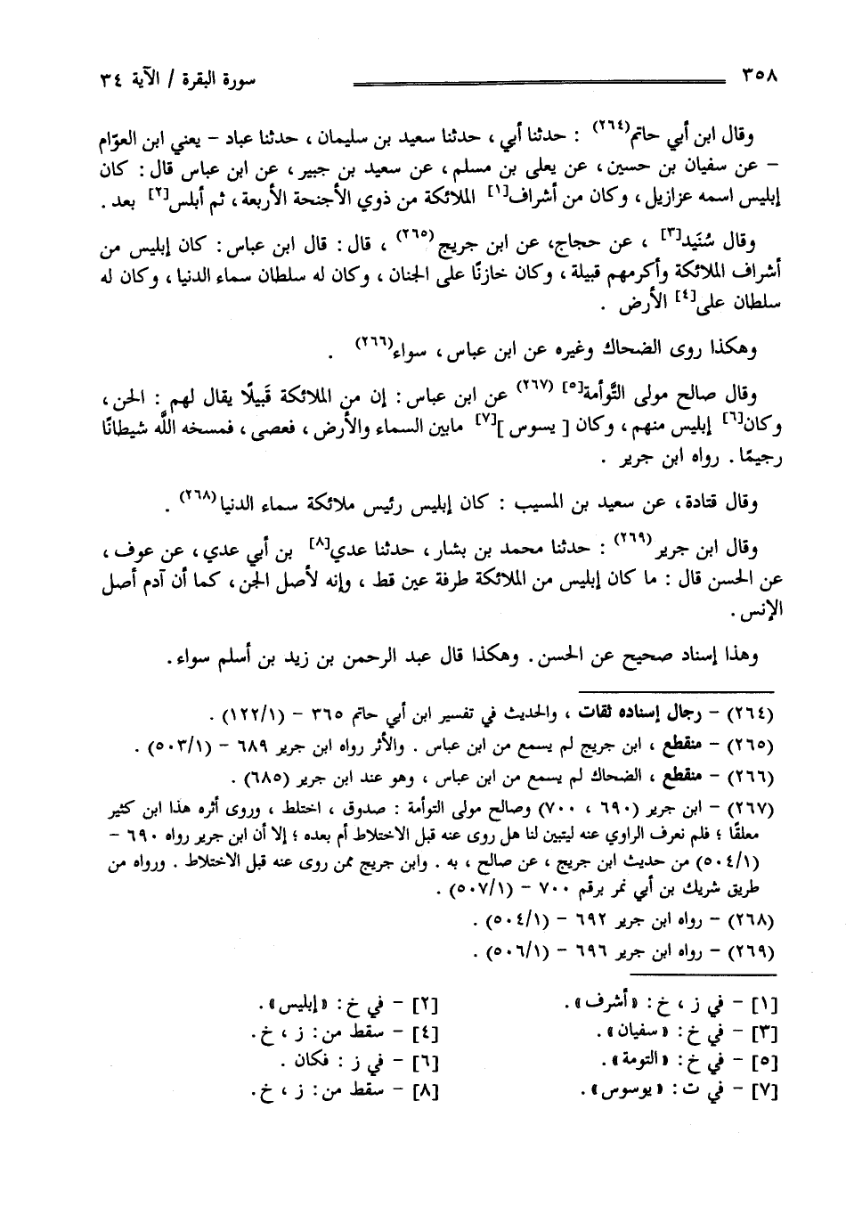 وَقَالَ اِبْن أَبِي حَاتِم حَدَّثَنَا أَبِي حَدَّثَنَا سَعِيد بْن سُلَيْمَان حَدَّثَنَا عَبَّاد يَعْنِي اِبْن الْعَوَّام عَنْ سُفْيَان بْن حُسَيْن عَنْ يَعْلَى بْن مُسْلِم عَنْ سَعِيد بْن جُبَيْر عَنْ اِبْن عَبَّاس قَالَ : كَانَ إِبْلِيس اِسْمه عَزَازِيل وَكَانَ مِنْ أَشْرَاف الْمَلَائِكَة مِنْ ذَوِي الْأَجْنِحَة الْأَرْبَعَة ثُمَّ أُبْلِسَ بَعْدُ وَقَالَ سُنَيْد : عَنْ حَجَّاج عَنْ اِبْن جُرَيْج قَالَ : قَالَ اِبْن عَبَّاس : كَانَ إِبْلِيس مِنْ أَشْرَاف الْمَلَائِكَة وَأَكْرَمهمْ قَبِيلَة وَكَانَ خَازِنًا عَلَى الْجِنَان وَكَانَ لَهُ سُلْطَان سَمَاء الدُّنْيَا وَكَانَ لَهُ سُلْطَان عَلَى الْأَرْض وَهَكَذَا رَوَى الضَّحَّاك وَغَيْره عَنْ اِبْن عَبَّاس سَوَاء .