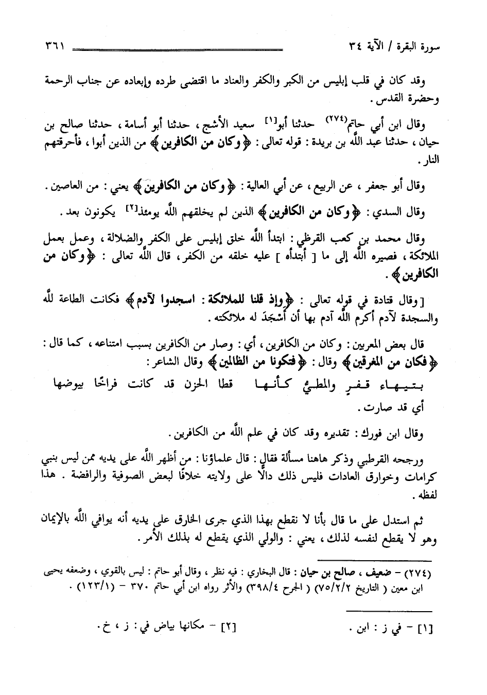 وَقَدْ كَانَ فِي قَلْب إِبْلِيس مِنْ الْكِبْر - وَالْكُفْر - وَالْعِنَاد مَا اِقْتَضَى طَرْده وَإِبْعَاده عَنْ جِنَاب الرَّحْمَة وَحَضْرَة الْقُدْس قَالَ بَعْض الْمُعْرِبِينَ وَكَانَ مِنْ الْكَافِرِينَ أَيْ وَصَارَ مِنْ الْكَافِرِينَ بِسَبَبِ اِمْتِنَاعه كَمَا قَالَ " فَكَانَ مِنْ الْمُغْرَقِينَ" وَقَالَ " فَتَكُونَا مِنْ الظَّالِمِينَ " وَقَالَ الشَّاعِر :