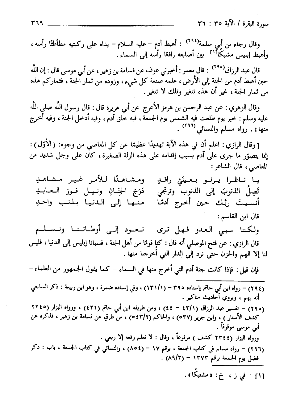 وَقَالَ رَجَاء بْن سَلَمَة : أُهْبِطَ آدَم عَلَيْهِ السَّلَام يَدَاهُ عَلَى رُكْبَتَيْهِ مُطَأْطِئًا رَأْسه وَأُهْبِطَ إِبْلِيس مُشَبِّكًا بَيْن أَصَابِعه رَافِعًا رَأْسه إِلَى السَّمَاء .