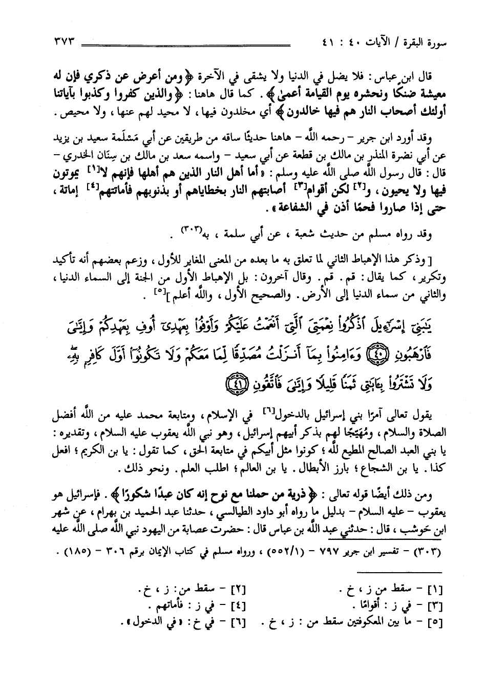 أَوْرَدَ اِبْن جَرِير هَاهُنَا حَدِيثًا سَاقَهُ مِنْ طَرِيقَيْنِ عَنْ أَبِي سَلَمَة سَعِيد بْن يَزِيد عَنْ أَبِي نَضْرَة الْمُنْذِر بْن مَالِك بْن قِطْعَة عَنْ أَبِي سَعِيد وَاسْمه سَعْد بْن مَالِك بْن سِنَان الْخُدْرِيّ قَالَ : قَالَ رَسُول اللَّه صَلَّى اللَّه عَلَيْهِ وَسَلَّمَ " أَمَّا أَهْل النَّار الَّذِينَ هُمْ أَهْلهَا فَلَا يَمُوتُونَ فِيهَا وَلَا يَحْيَوْنَ وَلَكِنَّ أَقْوَام أَصَابَتْهُمْ النَّار بِخَطَايَاهُمْ فَأَمَاتَتْهُمْ إِمَاتَة حَتَّى إِذَا صَارُوا فَحْمًا أَذِنَ فِي الشَّفَاعَة " وَقَدْ رَوَاهُ مُسْلِم مِنْ حَدِيث شُعْبَة عَنْ أَبِي سَلَمَة بِهِ .