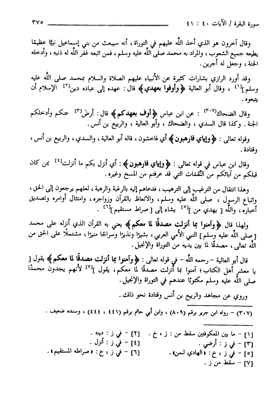 وَقَدْ أَوْرَدَ الرَّازِيّ بِشَارَات كَثِيرَة عَنْ الْأَنْبِيَاء عَلَيْهِمْ الصَّلَاة وَالسَّلَام بِمُحَمَّدٍ صَلَّى اللَّه عَلَيْهِ وَسَلَّمَ وَقَالَ أَبُو الْعَالِيَة " وَأَوْفُوا بِعَهْدِي " قَالَ عَهْده إِلَى عِبَاده دِين الْإِسْلَام وَأَنْ يَتَّبِعُوهُ .