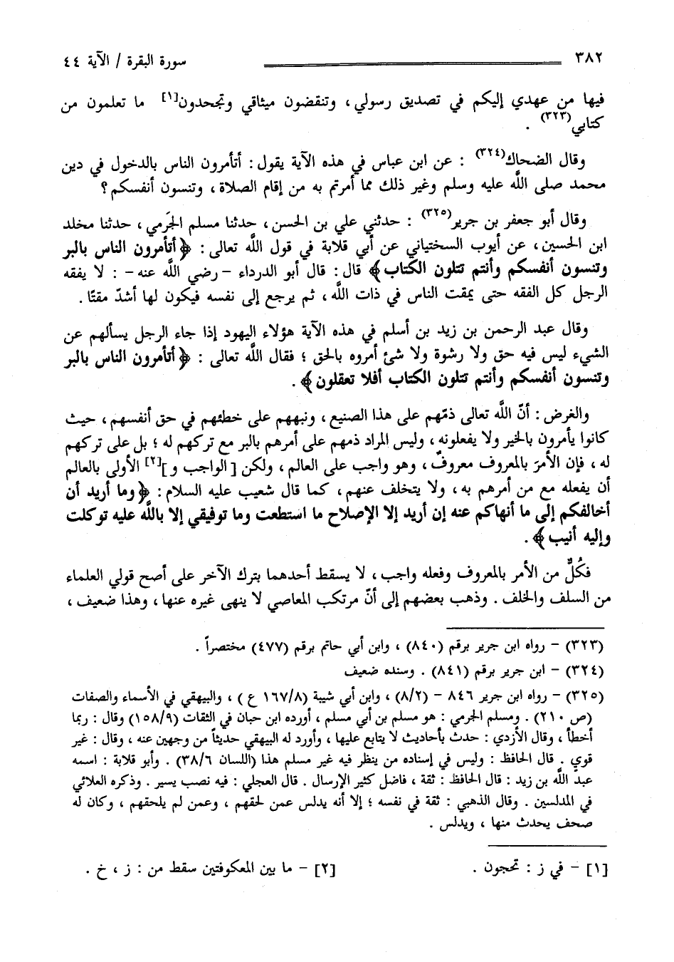 فِيهَا مِنْ عَهْدِي إِلَيْكُمْ فِي تَصْدِيق رَسُولِي وَتَنْقُضُونَ مِيثَاقِي وَتَجْحَدُونَ مَا تَعْلَمُونَ مِنْ كِتَابِي وَقَالَ الضَّحَّاك عَنْ اِبْن عَبَّاس فِي هَذِهِ الْآيَة يَقُول أَتَأْمُرُونَ النَّاس بِالدُّخُولِ فِي دِين مُحَمَّد صَلَّى اللَّه عَلَيْهِ وَسَلَّمَ وَغَيْر ذَلِكَ مِمَّا أُمِرْتُمْ بِهِ مِنْ إِقَام الصَّلَاة وَتَنْسَوْنَ أَنْفُسكُمْ وَقَالَ أَبُو جَعْفَر بْن جَرِير حَدَّثَنِي عَلِيّ بْن الْحَسَن حَدَّثَنَا أَسْلَمَ الْحَرَمِيّ حَدَّثَنَا مَخْلَد بْن الْحُسَيْن عَنْ أَيُّوب السِّخْتِيَانِيّ عَنْ أَبِي قِلَابَة فِي قَوْل اللَّه تَعَالَى " أَتَأْمُرُونَ النَّاس بِالْبِرِّ وَتَنْسَوْنَ أَنْفُسكُمْ وَأَنْتُمْ تَتْلُونَ الْكِتَاب " قَالَ أَبُو الدَّرْدَاء رَضِيَ اللَّه عَنْهُ لَا يَفْقَهُ الرَّجُلُ كُلَّ الْفِقْه حَتَّى يَمْقُتَ النَّاسَ فِي ذَات اللَّه ثُمَّ يَرْجِع إِلَى نَفْسه فَيَكُون لَهَا أَشَدّ مَقْتًا وَقَالَ عَبْد الرَّحْمَن بْن زَيْد بْن أَسْلَمَ فِي هَذِهِ الْآيَة هَؤُلَاءِ الْيَهُود إِذَا جَاءَ الرَّجُل سَأَلَهُمْ عَنْ الشَّيْء لَيْسَ فِيهِ حَقّ وَلَا رِشْوَة أَمَرُوهُ بِالْحَقِّ فَقَالَ اللَّه تَعَالَى " أَتَأْمُرُونَ النَّاس بِالْبِرِّ وَتَنْسَوْنَ أَنْفُسكُمْ وَأَنْتُمْ تَتْلُونَ الْكِتَاب أَفَلَا تَعْقِلُونَ " وَالْغَرَض أَنَّ اللَّه تَعَالَى ذَمَّهُمْ عَلَى هَذَا الصَّنِيع وَنَبَّهَهُمْ عَلَى خَطَئِهِمْ فِي حَقّ أَنْفُسهمْ حَيْثُ كَانُوا يَأْمُرُونَ بِالْخَيْرِ وَلَا يَفْعَلُونَهُ وَلَيْسَ الْمُرَاد ذَمّهمْ عَلَى أَمْرهمْ بِالْبِرِّ مَعَ تَرْكهمْ لَهُ بَلْ عَلَى تَرْكهمْ لَهُ فَإِنَّ الْأَمْر بِالْمَعْرُوفِ مَعْرُوف وَهُوَ وَاجِب عَلَى الْعَالِم وَلَكِنَّ الْوَاجِب وَالْأَوْلَى بِالْعَالِمِ أَنْ يَفْعَلهُ مَعَ مَنْ أَمَرَهُمْ بِهِ وَلَا يَتَخَلَّف عَنْهُمْ كَمَا قَالَ شُعَيْب عَلَيْهِ السَّلَام " وَمَا أُرِيد أَنْ أُخَالِفكُمْ إِلَى مَا أَنْهَاكُمْ عَنْهُ إِنْ أُرِيد إِلَّا الْإِصْلَاح مَا اِسْتَطَعْت وَمَا تَوْفِيقِي إِلَّا بِاَللَّهِ عَلَيْهِ تَوَكَّلْت وَإِلَيْهِ أُنِيب " فَكُلّ مِنْ الْأَمْر بِالْمَعْرُوفِ وَفِعْله وَاجِب لَا يَسْقُط أَحَدهمَا بِتَرْكِ الْآخَر عَلَى أَصَحّ قَوْلَيْ الْعُلَمَاء مِنْ السَّلَف وَالْخَلَف وَذَهَبَ بَعْضهمْ إِلَى أَنَّ مُرْتَكِب الْمَعَاصِي يَنْهَى غَيْره عَنْهَا وَهَذَا ضَعِيف