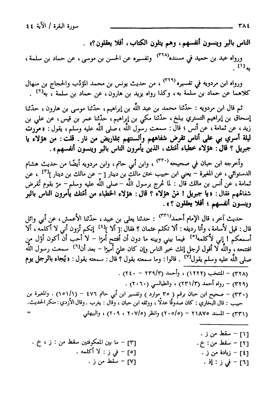 النَّاس بِالْبِرِّ وَيَنْسَوْنَ أَنْفُسهمْ وَهُمْ يَتْلُونَ الْكِتَاب أَفَلَا يَعْقِلُونَ " وَرَوَاهُ عَبْد بْن حُمَيْد فِي مُسْنَده وَتَفْسِيره عَنْ الْحَسَن بْن مُوسَى عَنْ حَمَّاد بْن سَلَمَة بِهِ وَرَوَاهُ اِبْن مَرْدَوَيْهِ فِي تَفْسِيره مِنْ حَدِيث يُونُس بْن مُحَمَّد الْمُؤَدِّب وَالْحَجَّاج بْن مِنْهَال كِلَاهُمَا عَنْ حَمَّاد بْن سَلَمَة بِهِ وَكَذَا رَوَاهُ يَزِيد بْن هَارُون عَنْ حَمَّاد بْن سَلَمَة بِهِ ثُمَّ قَالَ اِبْن مَرْدَوَيْهِ حَدَّثَنَا مُحَمَّد بْن عَبْد اللَّه بْن إِبْرَاهِيم حَدَّثَنَا مُوسَى بْن هَارُون حَدَّثَنَا .