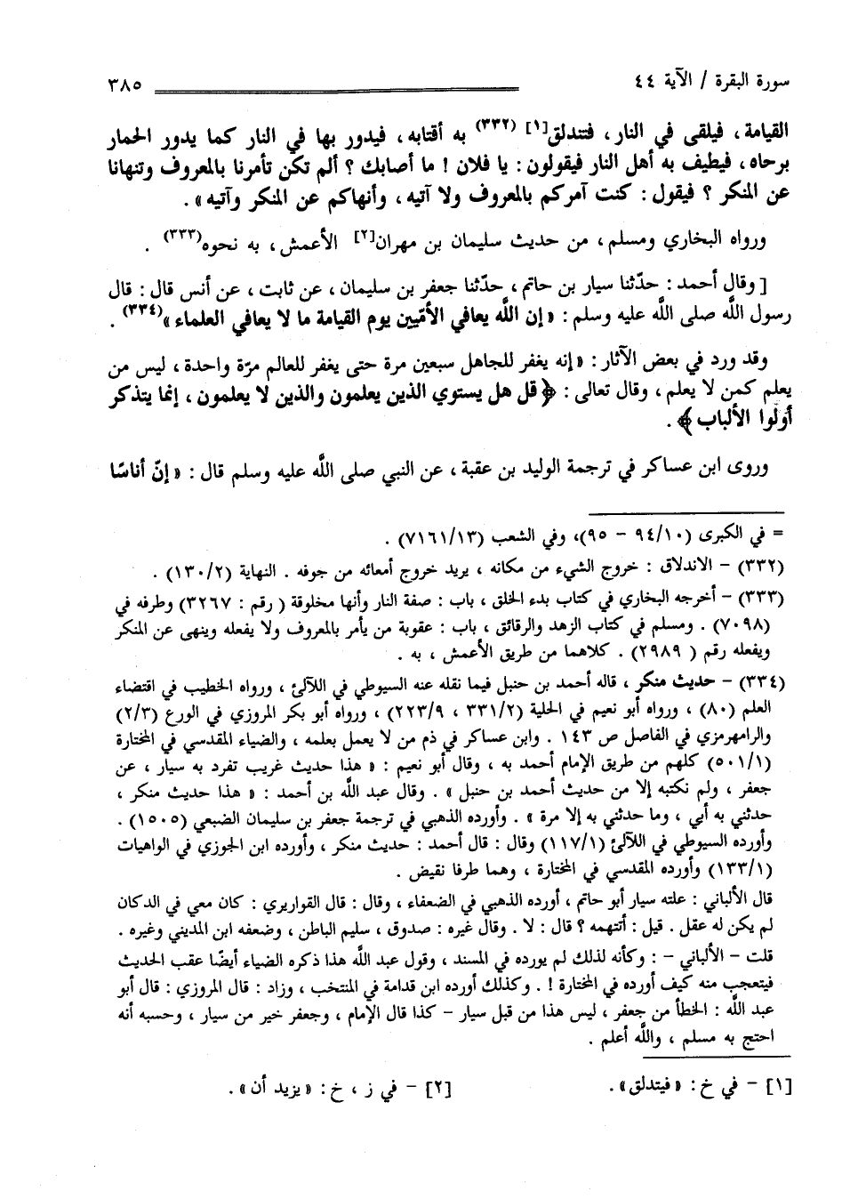 الْقِيَامَة فَيُلْقَى فِي النَّار فَتَنْدَلِق بِهِ أَقْتَابه فَيَدُور بِهَا فِي النَّار كَمَا يَدُور الْحِمَار بِرَحَاهُ فَيَطِيف بِهِ أَهْل النَّار فَيَقُولُونَ يَا فُلَان مَا أَصَابَك أَلَمْ تَكُنْ تَأْمُرنَا بِالْمَعْرُوفِ وَتَنْهَانَا عَنْ الْمُنْكَر ؟ فَيَقُول كُنْت آمُركُمْ بِالْمَعْرُوفِ وَلَا آتِيه وَأَنْهَاكُمْ عَنْ الْمُنْكَر وَآتِيه " وَرَوَاهُ الْبُخَارِيّ وَمُسْلِم مِنْ حَدِيث سُلَيْمَان بْن مِهْرَان الْأَعْمَش بِهِ نَحْوه وَقَالَ : أَحْمَد حَدَّثَنَا سَيَّار بْن حَاتِم حَدَّثَنَا جَعْفَر بْن سُلَيْمَان عَنْ ثَابِت عَنْ أَنَس قَالَ : قَالَ رَسُول اللَّه صَلَّى اللَّه عَلَيْهِ وَسَلَّمَ " إِنَّ اللَّه يُعَافِي الْأُمِّيِّينَ يَوْم الْقِيَامَة مَا لَا يُعَافِي الْعُلَمَاء " وَقَدْ وَرَدَ فِي بَعْض الْآثَار : إِنَّهُ يَغْفِر لِلْجَاهِلِ سَبْعِينَ مَرَّة حَتَّى يَغْفِر لِلْعَالِمِ مَرَّة وَاحِدَة لَيْسَ مَنْ يَعْلَم كَمَنْ لَا يَعْلَم .