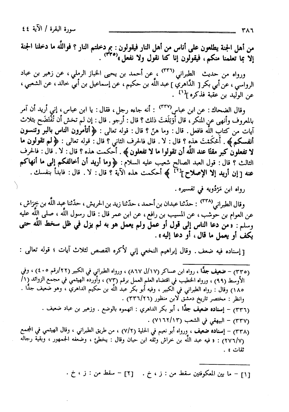 مِنْ أَهْل الْجَنَّة يَطَّلِعُونَ عَلَى أُنَاس مِنْ أَهْل النَّار فَيَقُولُونَ بِمَ دَخَلْتُمْ النَّار ؟ فُو اللَّه مَا دَخَلْنَا الْجَنَّة إِلَّا بِمَا تَعَلَّمْنَا مِنْكُمْ فَيَقُولُونَ إِنَّا كُنَّا نَقُول وَلَا نَفْعَل " وَرَوَاهُ اِبْن جَرِير الطَّبَرِيّ عَنْ أَحْمَد بْن يَحْيَى الْخَبَّاز الرَّمْلِيّ عَنْ زُهَيْر بْن عَبَّاد الرُّوَاسِيّ عَنْ أَبِي بَكْر الزُّهْرِيّ عَبْد اللَّه بْن حَكِيم عَنْ إِسْمَاعِيل بْن أَبِي خَالِد عَنْ الشَّعْبِيّ عَنْ الْوَلِيد بْن عُقْبَة فَذَكَرَهُ وَقَالَ : الضَّحَّاك عَنْ اِبْن عَبَّاس إِنَّهُ جَاءَهُ رَجُل فَقَالَ : يَا اِبْن عَبَّاس إِنِّي أُرِيد أَنْ آمُر بِالْمَعْرُوفِ وَأَنْهَى عَنْ الْمُنْكَر قَالَ أَبْلَغْت ذَلِكَ ؟ قَالَ أَرْجُو قَالَ إِنْ لَمْ تَخْشَ أَنْ تُفْتَضَح بِثَلَاثِ آيَات مِنْ كِتَاب اللَّه فَافْعَلْ قَالَ وَمَا هُنَّ ؟ قَالَ قَوْله تَعَالَى" أَتَأْمُرُونَ النَّاس بِالْبِرِّ وَتَنْسَوْنَ أَنْفُسكُمْ " أَحْكَمْت هَذِهِ ؟ قَالَ لَا قَالَ فَالْحَرْف الثَّانِي قَالَ قَوْله تَعَالَى" لِمَ تَقُولُونَ مَا لَا تَفْعَلُونَ ؟ كَبُرَ مَقْتًا عِنْد اللَّه أَنْ تَقُولُوا مَا لَا تَفْعَلُونَ " أَحْكَمْت هَذِهِ ؟ قَالَ لَا قَالَ فَالْحَرْف الثَّالِث قَالَ قَوْل الْعَبْد الصَّالِح شُعَيْب عَلَيْهِ السَّلَام " وَمَا أُرِيد أَنْ أُخَالِفكُمْ إِلَى مَا أَنْهَاكُمْ عَنْهُ إِنْ أُرِيد إِلَّا الْإِصْلَاح " أَحْكَمْت هَذِهِ الْآيَة ؟ قَالَ لَا قَالَ فَابْدَأْ بِنَفْسِك .
