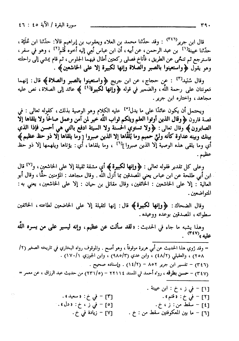 قَالَ اِبْن جَرِير وَقَدْ حَدَّثَنَا مُحَمَّد بْن الْفَضْل وَيَعْقُوب بْن إِبْرَاهِيم قَالَا حَدَّثَنَا اِبْن عُلَيَّة حَدَّثَنَا عُيَيْنَة بْن عَبْد الرَّحْمَن عَنْ أَبِيهِ أَنَّ اِبْن عَبَّاس نَعَى إِلَيْهِ أَخُوهُ قُثَم وَهُوَ فِي سَفَر فَاسْتَرْجَعَ ثُمَّ تَنَحَّى عَنْ الطَّرِيق فَأَنَاخَ فَصَلَّى رَكْعَتَيْنِ أَطَالَ فِيهِمَا الْجُلُوس ثُمَّ قَامَ يَمْشِي إِلَى رَاحِلَته وَهُوَ يَقُول " وَاسْتَعِينُوا بِالصَّبْرِ وَالصَّلَاة وَإِنَّهَا لَكَبِيرَةٌ إِلَّا عَلَى الْخَاشِعِينَ" وَقَالَ سُنَيْد عَنْ حَجَّاج عَنْ اِبْن جُرَيْج " وَاسْتَعِينُوا بِالصَّبْرِ وَالصَّلَاة " قَالَ إِنَّهُمَا مَعُونَتَانِ عَلَى رَحْمَة اللَّه وَالضَّمِير فِي قَوْله وَإِنَّهَا لَكَبِيرَةٌ عَائِد إِلَى الصَّلَاة نَصَّ عَلَيْهِ مُجَاهِد وَاخْتَارَهُ اِبْن جَرِير وَيَحْتَمِل أَنْ يَكُون عَائِدًا عَلَى مَا يَدُلّ عَلَيْهِ الْكَلَام وَهُوَ الْوَصِيَّة بِذَلِكَ كَقَوْلِهِ تَعَالَى فِي قِصَّة قَارُون " وَقَالَ الَّذِينَ أُوتُوا الْعِلْم وَيْلكُمْ ثَوَاب اللَّه خَيْر لِمَنْ آمَنَ وَعَمِلَ صَالِحًا وَلَا يُلَقَّاهَا إِلَّا الصَّابِرُونَ " وَقَالَ تَعَالَى" وَلَا تَسْتَوِي الْحَسَنَةُ وَلَا السَّيِّئَةُ اِدْفَعْ بِاَلَّتِي هِيَ أَحْسَن فَإِذَا الَّذِي بَيْنك وَبَيْنه عَدَاوَةٌ كَأَنَّهُ وَلِيٌّ حَمِيمٌ وَمَا يُلَقَّاهَا إِلَّا الَّذِينَ صَبَرُوا وَمَا يُلَقَّاهَا إِلَّا ذُو حَظّ عَظِيم " أَيْ وَمَا يُلَقَّى هَذِهِ الْوَصِيَّة إِلَّا الَّذِينَ صَبَرُوا وَمَا يُلَقَّاهَا أَيْ يُؤْتَاهَا وَيُلْهَمهَا إِلَّا ذُو حَظّ عَظِيم .