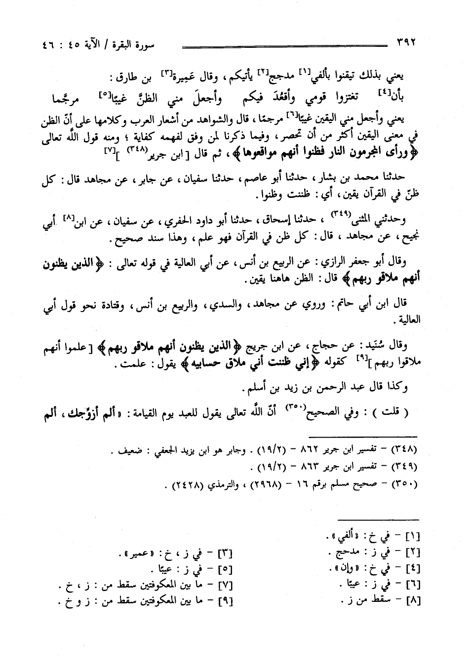 يَعْنِي وَأَجْعَل مِنِّي الْيَقِين غَيْبًا مُرَجَّمًا قَالَ وَالشَّوَاهِد مِنْ أَشْعَار الْعَرَب وَكَلَامهَا عَلَى أَنَّ الظَّنّ فِي مَعْنَى الْيَقِين أَكْثَر مِنْ أَنْ تُحْصَر وَفِيمَا ذَكَرْنَا لِمَنْ وُفِّقَ لِفَهْمِهِ كِفَايَة وَمِنْهُ قَوْل اللَّه تَعَالَى " وَرَأَى الْمُجْرِمُونَ النَّار فَظَنُّوا أَنَّهُمْ مُوَاقِعُوهَا " ثُمَّ قَالَ اِبْن جَرِير حَدَّثَنَا مُحَمَّد بْن بَشَّار حَدَّثَنَا أَبُو عَاصِم حَدَّثَنَا سُفْيَان عَنْ جَابِر عَنْ مُجَاهِد كُلّ ظَنّ فِي الْقُرْآن يَقِين أَيْ ظَنَنْت وَظَنُّوا وَحَدَّثَنِي الْمُثَنَّى حَدَّثَنَا أَبُو دَاوُد الْجَبْرِيّ عَنْ سُفْيَان عَنْ اِبْن أَبِي نَجِيح عَنْ مُجَاهِد قَالَ كُلّ ظَنّ فِي الْقُرْآن فَهُوَ عِلْم وَهَذَا سَنَد صَحِيح وَقَالَ أَبُو جَعْفَر الرَّازِيّ عَنْ الرَّبِيع بْن أَنَس عَنْ أَبِي الْعَالِيَة فِي قَوْله تَعَالَى " الَّذِينَ يَظُنُّونَ أَنَّهُمْ مُلَاقُو رَبّهمْ " قَالَ : الظَّنّ هَاهُنَا يَقِين قَالَ : اِبْن أَبِي حَاتِم وَرُوِيَ عَنْ مُجَاهِد وَالسُّدِّيّ وَالرَّبِيع بْن أَنَس وَقَتَادَة نَحْو قَوْل أَبِي الْعَالِيَة وَقَالَ سُنَيْد عَنْ حَجَّاج عَنْ اِبْن جُرَيْج " الَّذِينَ يَظُنُّونَ أَنَّهُمْ مُلَاقُو رَبّهمْ " عَلِمُوا أَنَّهُمْ مُلَاقُو رَبّهمْ كَقَوْلِهِ " إِنِّي ظَنَنْت أَنِّي مُلَاقٍ حِسَابَيْهِ " يَقُول عَلِمْت وَكَذَا قَالَ عَبْد الرَّحْمَن بْن زَيْد بْن أَسْلَمَ " قُلْت " وَفِي الصَّحِيح أَنَّ اللَّه تَعَالَى يَقُول لِلْعَبْدِ يَوْم الْقِيَامَة " أَلَمْ أُزَوِّجك أَلَمْ