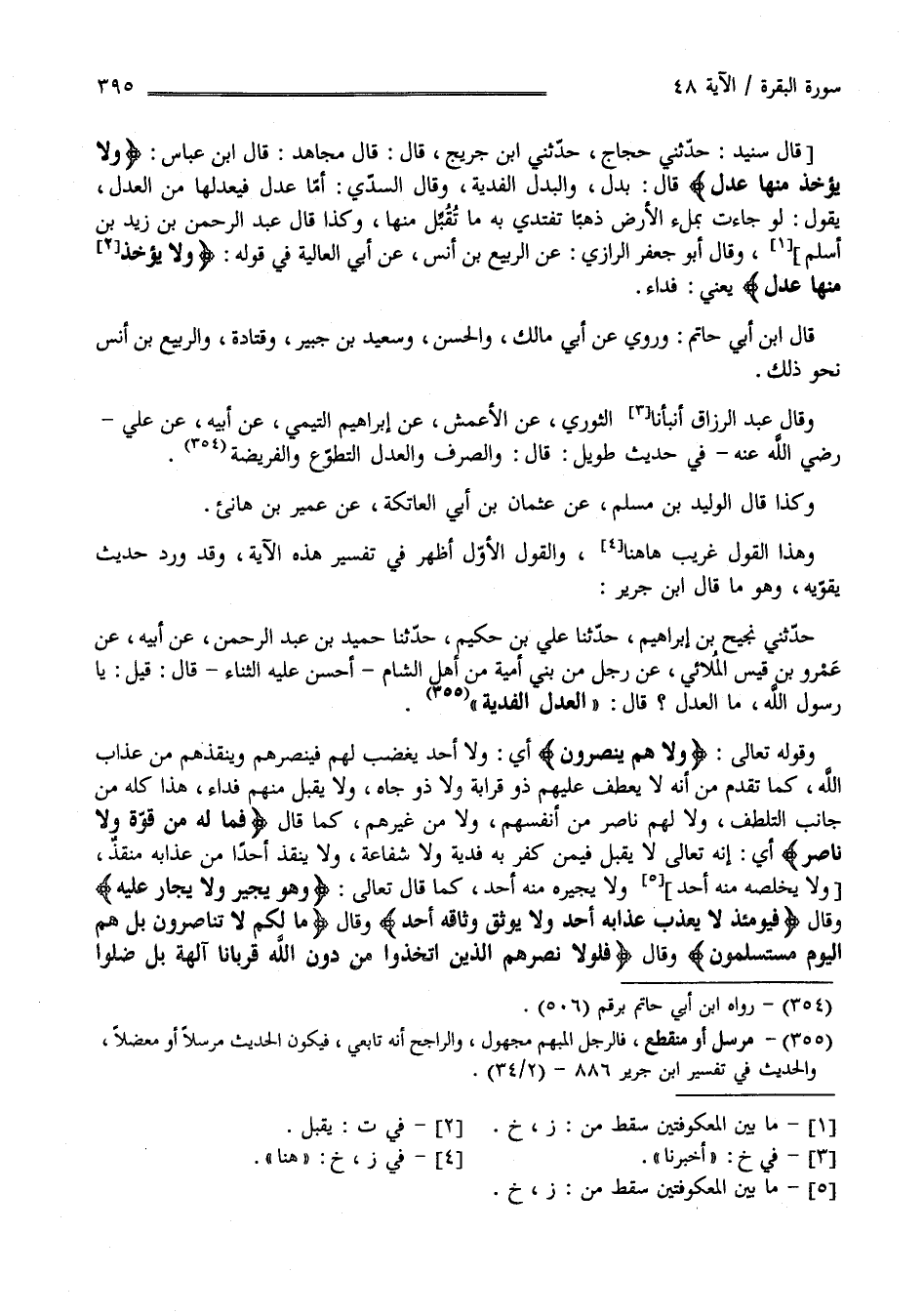 قَالَ : سُنَيْد حَدَّثَنِي حَجَّاج حَدَّثَنِي اِبْن جُرَيْج قَالَ : قَالَ مُجَاهِد قَالَ اِبْن عَبَّاس " وَلَا يُؤْخَذ مِنْهَا عَدْل " قَالَ بَدَل وَالْبَدَل الْفِدْيَة وَقَالَ السُّدِّيّ أَمَّا عَدْل فَيُعَدُّ لَهَا مِنْ الْعَدْل يَقُول لَوْ جَاءَتْ بِمِلْءِ الْأَرْض ذَهَبًا تَفْتَدِي بِهِ مَا تُقَبِّل مِنْهَا وَكَذَا قَالَ عَبْد الرَّحْمَن بْن زَيْد بْن أَسْلَمَ وَقَالَ أَبُو جَعْفَر الرَّازِيّ عَنْ الرَّبِيع بْن أَنَس عَنْ أَبِي الْعَالِيَة فِي قَوْله " وَلَا يُقْبَل مِنْهَا عَدْل " يَعْنِي فِدَاء قَالَ اِبْن أَبِي حَاتِم وَرُوِيَ عَنْ أَبِي مَالِك وَالْحَسَن وَسَعِيد بْن جُبَيْر وَقَتَادَة وَالرَّبِيع بْن أَنَس نَحْو ذَلِكَ وَقَالَ عَبْد الرَّزَّاق أَنْبَأَنَا الثَّوْرِيّ عَنْ الْأَعْمَش عَنْ إِبْرَاهِيم التَّيْمِيّ عَنْ أَبِيهِ عَنْ عَلِيّ رَضِيَ اللَّه عَنْهُ فِي حَدِيث طَوِيل قَالَ وَالصَّرْف وَالْعَدْل التَّطَوُّع وَالْفَرِيضَة وَكَذَا قَالَ الْوَلِيد بْن مُسْلِم عَنْ عُثْمَان بْن أَبِي الْعَاتِكَة عَنْ عُمَيْر بْن هَانِئ وَهَذَا الْقَوْل غَرِيب هَاهُنَا وَالْقَوْل الْأَوَّل أَظْهَر فِي تَفْسِير هَذِهِ الْآيَة وَقَدْ وَرَدَ حَدِيث يُقَوِّيه وَهُوَ مَا قَالَ اِبْن جَرِير حَدَّثَنِي نَجِيح بْن إِبْرَاهِيم حَدَّثَنَا عَلِيّ بْن حَكِيم حَدَّثَنَا حُمَيْد بْن عَبْد الرَّحْمَن عَنْ أَبِيهِ عَنْ عَمْرو بْن قَيْس الْمُلَائِيّ عَنْ رَجُل مِنْ بَنِي أُمَيَّة مِنْ أَهْل الشَّام أَحْسَن عَلَيْهِ الثَّنَاء قَالَ قِيلَ يَا رَسُول اللَّه مَا الْعَدْل ؟ قَالَ " الْعَدْل الْفِدْيَة " وَقَوْله تَعَالَى " وَلَا هُمْ يُنْصَرُونَ " أَيْ وَلَا أَحَد يَغْضَب لَهُمْ فَيَنْصُرهُمْ وَيُنْقِذهُمْ مِنْ عَذَاب اللَّه كَمَا تَقَدَّمَ مِنْ أَنَّهُ لَا يَعْطِف عَلَيْهِمْ ذُو قَرَابَة وَلَا ذُو جَاه وَلَا يُقْبَل مِنْهُمْ فِدَاء هَذَا كُلّه مِنْ جَانِب التَّلَطُّف وَلَا لَهُمْ نَاصِر مِنْ أَنْفُسهمْ وَلَا مِنْ غَيْرهمْ كَمَا قَالَ" فَمَا لَهُ مِنْ قُوَّة وَلَا نَاصِر " أَيْ أَنَّهُ تَعَالَى لَا يَقْبَل فِيمَنْ كَفَرَ بِهِ فِدْيَة وَلَا شَفَاعَة وَلَا يُنْقِذ أَحَدًا مِنْ عَذَابه مُنْقِذ وَلَا يُخَلِّص مِنْهُ أَحَد وَلَا يُجِير مِنْهُ أَحَد كَمَا قَالَ تَعَالَى " وَهُوَ يُجِير وَلَا يُجَار عَلَيْهِ " وَقَالَ " فَيَوْمَئِذٍ لَا يُعَذِّب عَذَابه أَحَد وَلَا يُوثِق وَثَاقه أَحَد " وَقَالَ " مَا لَكُمْ لَا تَنَاصَرُونَ بَلْ هُمْ الْيَوْم مُسْتَسْلِمُونَ" وَقَالَ " فَلَوْلَا نَصَرَهُمْ الَّذِينَ اِتَّخَذُوا مِنْ دُون اللَّه قُرْبَانًا آلِهَة بَلْ ضَلُّوا