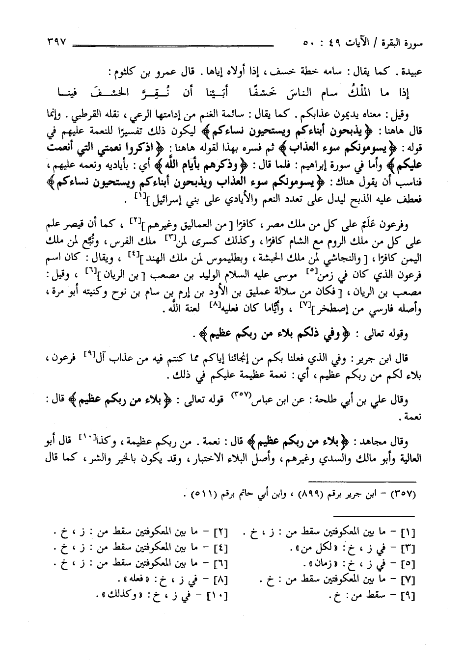 نَقَلَهُ الْقُرْطُبِيّ وَإِنَّمَا قَالَ هَاهُنَا " يُذَبِّحُونَ أَبْنَاءَكُمْ وَيَسْتَحْيُونَ نِسَاءَكُمْ " لِيَكُونَ ذَلِكَ تَفْسِيرًا لِلنِّعْمَةِ عَلَيْهِمْ فِي قَوْله " يَسُومُونَكُمْ سُوء الْعَذَاب" ثُمَّ فَسَّرَهُ بِهَذَا لِقَوْلِهِ هَاهُنَا " اُذْكُرُوا نِعْمَتِيَ الَّتِي أَنْعَمْت عَلَيْكُمْ " وَأَمَّا فِي سُورَة إِبْرَاهِيم فَلَمَّا قَالَ " وَذَكِّرْهُمْ بِأَيَّامِ اللَّه " أَيْ بِأَيَادِيهِ وَنِعَمه عَلَيْهِمْ فَنَاسَبَ أَنْ يَقُول هُنَاكَ " يَسُومُونَكُمْ سُوء الْعَذَاب يُذَبِّحُونَ أَبْنَاءَكُمْ وَيَسْتَحْيُونَ نِسَاءَكُمْ " بِعَطْفِ عَلَيْهِ الذَّبْح لِيَدُلّ عَلَى تَعَدُّد النِّعَم وَالْأَيَادِي عَلَى بَنِي إِسْرَائِيل .