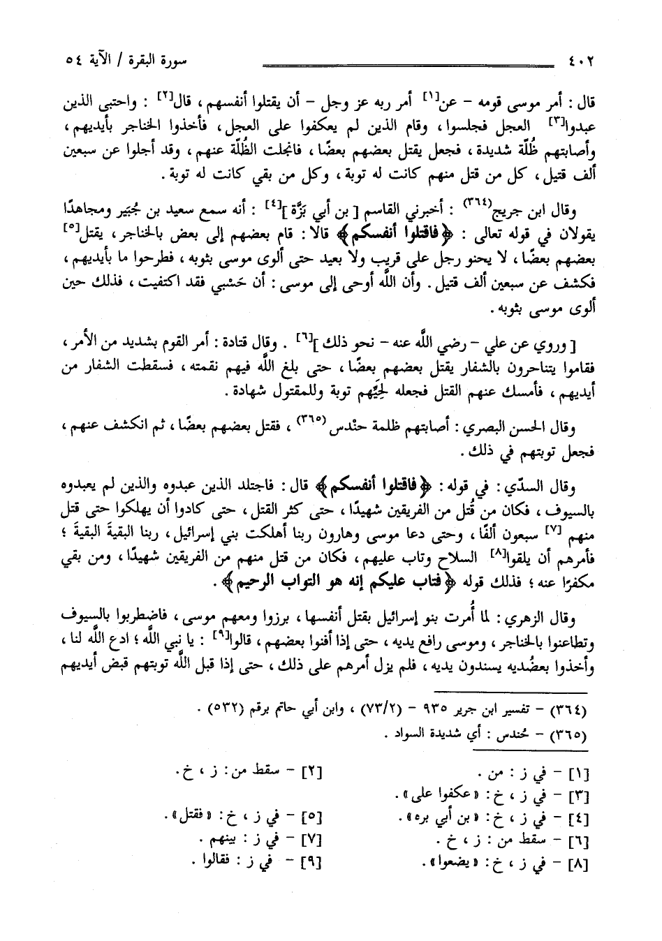 قَالَ أَمَرَ مُوسَى قَوْمه عَنْ أَمْر رَبّه عَزَّ وَجَلَّ أَنْ يَقْتُلُوا أَنْفُسهمْ قَالَ : وَأَخْبَرَ الَّذِينَ عَبَدُوا الْعِجْل فَجَلَسُوا وَقَامَ الَّذِينَ لَمْ يَعْكُفُوا عَلَى الْعِجْل فَأَخَذُوا الْخَنَاجِر بِأَيْدِيهِمْ وَأَصَابَتْهُمْ ظُلْمَة شَدِيدَة فَجَعَلَ يَقْتُل بَعْضهمْ بَعْضًا فَانْجَلَتْ الظُّلْمَة عَنْهُمْ وَقَدْ جَلَوْا عَنْ سَبْعِينَ أَلْف قَتِيل كُلّ مَنْ قُتِلَ مِنْهُمْ كَانَ لَهُ تَوْبَة وَكُلّ مَنْ بَقِيَ كَانَتْ لَهُ تَوْبَة.