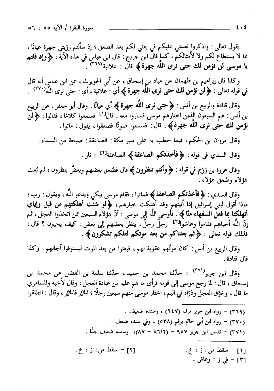 يَقُول تَعَالَى وَاذْكُرُوا نِعْمَتِيَ عَلَيْكُمْ فِي بَعْثِي لَكُمْ بَعْد الصَّعْق إِذْ سَأَلْتُمْ رُؤْيَتِي جَهْرَة عِيَانًا مِمَّا لَا يُسْتَطَاع لَكُمْ وَلَا لِأَمْثَالِكُمْ كَمَا قَالَ اِبْن جُرَيْج قَالَ : اِبْن عَبَّاس فِي هَذِهِ الْآيَة " وَإِذْ قُلْتُمْ يَا مُوسَى لَنْ نُؤْمِنَ لَك حَتَّى نَرَى اللَّه جَهْرَة " قَالَ عَلَانِيَة وَكَذَا قَالَ : إِبْرَاهِيم بْن طَهْمَان عَنْ عَبَّاد بْن إِسْحَاق عَنْ أَبِي الْحُوَيْرِث عَنْ اِبْن عَبَّاس أَنَّهُ قَالَ : فِي قَوْله تَعَالَى " لَنْ نُؤْمِن لَك حَتَّى نَرَى اللَّه جَهْرَة " أَيْ عَلَانِيَة أَيْ حَتَّى نَرَى اللَّه وَقَالَ قَتَادَة وَالرَّبِيع بْن أَنَس " حَتَّى نَرَى اللَّه جَهْرَة " أَيْ عِيَانًا وَقَالَ أَبُو جَعْفَر عَنْ الرَّبِيع بْن أَنَس هُمْ السَّبْعُونَ الَّذِينَ اِخْتَارَهُمْ مُوسَى فَسَارُوا مَعَهُ قَالَ فَسَمِعُوا كَلَامًا فَقَالُوا " لَنْ نُؤْمِن لَك حَتَّى نَرَى اللَّه جَهْرَة " قَالَ فَسَمِعُوا صَوْتًا فَصُعِقُوا يَقُول مَالُوا.