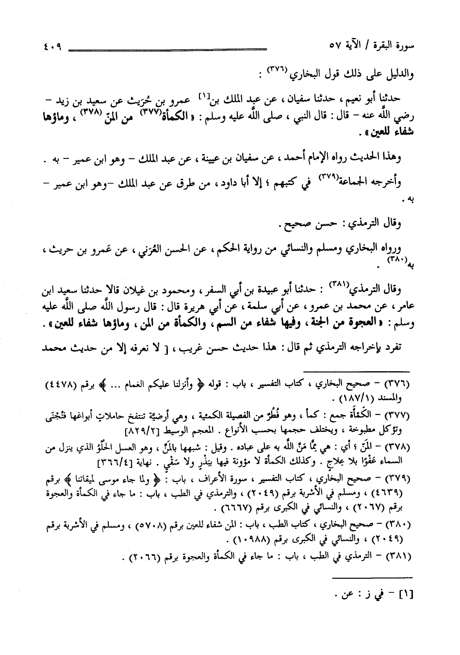 وَالدَّلِيل عَلَى ذَلِكَ قَوْل الْبُخَارِيّ حَدَّثَنَا أَبُو نُعَيْم حَدَّثَنَا سُفْيَان عَنْ عَبْد الْمَلِك بْن عُمَيْر بْن حُرَيْث عَنْ سَعِيد بْن زَيْد رَضِيَ اللَّه عَنْهُ قَالَ : قَالَ النَّبِيّ " الْكَمْأَة مِنْ الْمَنّ وَمَاؤُهَا شِفَاء لِلْعَيْنِ " وَهَذَا الْحَدِيث رَوَاهُ الْإِمَام أَحْمَد عَنْ سُفْيَان بْن عُيَيْنَة عَنْ عَبْد الْمَلِك وَهُوَ اِبْن عُمَيْر بِهِ وَأَخْرَجَهُ الْجَمَاعَة فِي كُتُبهمْ إِلَّا أَبَا دَاوُد مِنْ طُرُق عَنْ عَبْد الْمَلِك وَهُوَ اِبْن عُمَيْر بِهِ وَقَالَ التِّرْمِذِيّ حَسَن صَحِيح وَرَوَاهُ الْبُخَارِيّ وَمُسْلِم مِنْ رِوَايَة الْحَسَن الْعُرَنِيّ عَنْ عَمْرو بْن حُرَيْث بِهِ وَقَالَ : التِّرْمِذِيّ حَدَّثَنَا أَبُو عُبَيْدَة بْن أَبِي السَّفَر وَمَحْمُود بْن غَيْلَان قَالَا : حَدَّثَنَا سَعِيد بْن عَامِر عَنْ مُحَمَّد بْن عَمْرو عَنْ أَبِي سَلَمَة عَنْ أَبِي هُرَيْرَة قَالَ : قَالَ رَسُول اللَّه صَلَّى اللَّه عَلَيْهِ وَسَلَّمَ " الْعَجْوَة مِنْ الْجَنَّة وَفِيهَا شِفَاء مِنْ السُّمّ وَالْكَمْأَة مِنْ الْمَنّ وَمَاؤُهَا شِفَاء لِلْعَيْنِ " تَفَرَّدَ بِإِخْرَاجِهِ التِّرْمِذِيّ ثُمَّ قَالَ : هَذَا حَدِيث حَسَن غَرِيب لَا نَعْرِفهُ إِلَّا مِنْ حَدِيث مُحَمَّد بْن مُحَمَّد