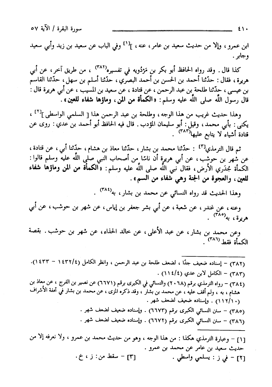 بْن عَمْرو وَلَا مِنْ حَدِيث سَعِيد بْن عَامِر عَنْهُ وَفِي الْبَاب عَنْ سَعِيد بْن زَيْد وَأَبِي سَعِيد وَجَابِر كَذَا قَالَ - وَقَدْ رَوَاهُ الْحَافِظ أَبُو بَكْر بْن مَرْدَوَيْهِ فِي تَفْسِيره مِنْ طَرِيق آخَر عَنْ أَبِي هُرَيْرَة فَقَالَ : حَدَّثَنَا أَحْمَد بْن الْحَسَن بْن أَحْمَد الْبَصْرِيّ حَدَّثَنَا أَسْلَم بْن سَهْل حَدَّثَنَا الْقَاسِم بْن عِيسَى حَدَّثَنَا طَلْحَة بْن عَبْد الرَّحْمَن عَنْ قَتَادَة عَنْ سَعِيد بْن الْمُسَيِّب عَنْ أَبِي هُرَيْرَة قَالَ : قَالَ رَسُول اللَّه صَلَّى اللَّه عَلَيْهِ وَسَلَّمَ " الْكَمْأَة مِنْ الْمَنّ وَمَاؤُهَا شِفَاء لِلْعَيْنِ " وَهَذَا حَدِيث غَرِيب مِنْ هَذَا الْوَجْه وَطَلْحَة بْن عَبْد الرَّحْمَن هَذَا السُّلَمِيّ الْوَاسِطِيّ يُكَنَّى بِأَبِي مُحَمَّد وَقِيلَ أَبُو سُلَيْمَان الْمُؤَدِّب قَالَ فِيهِ الْحَافِظ أَبُو أَحْمَد بْن عَدِيّ : رَوَى عَنْ قَتَادَة أَشْيَاء لَا يُتَابَع عَلَيْهَا .