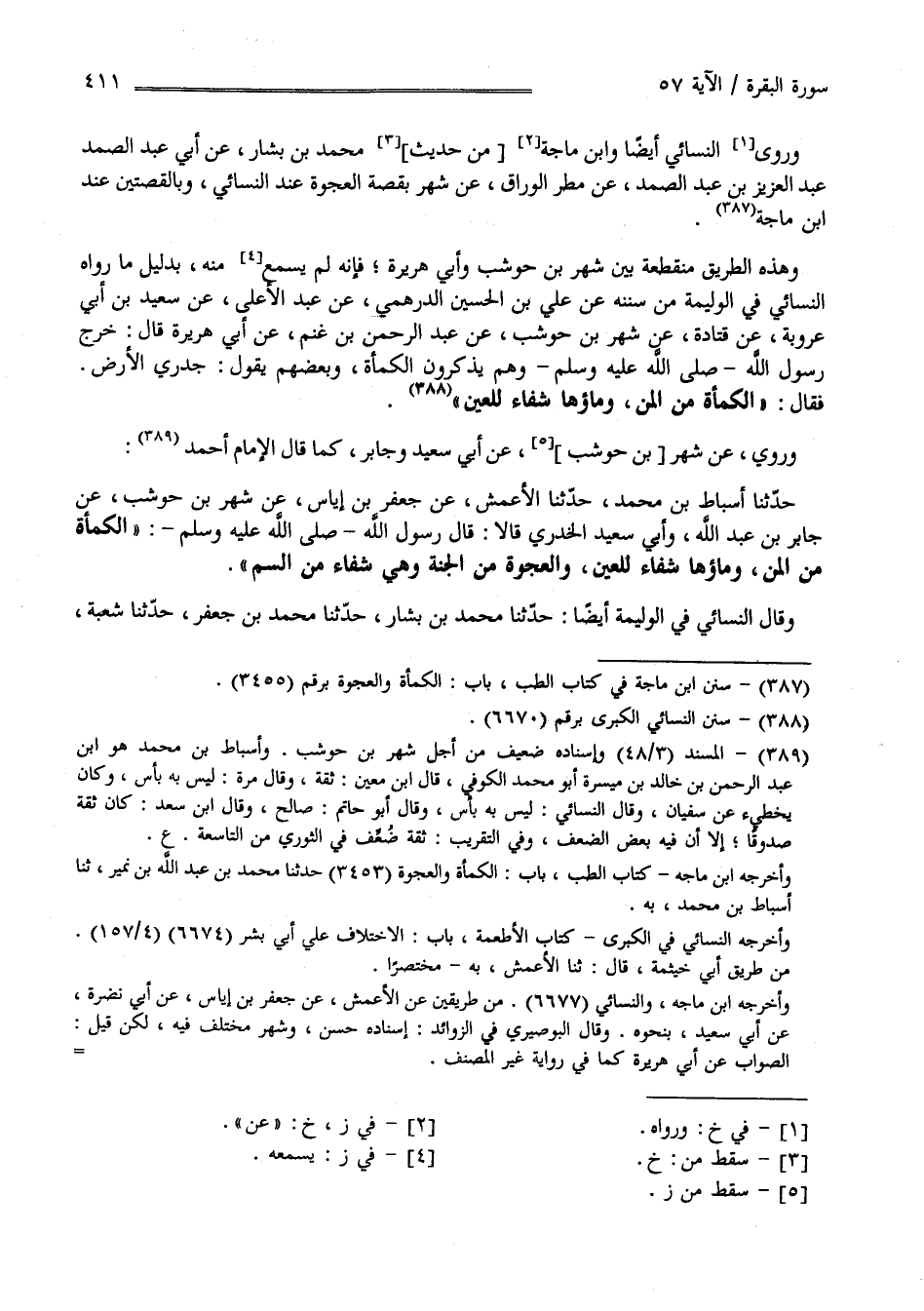 وَرَوَى النَّسَائِيّ أَيْضًا وَابْن مَاجَهْ مِنْ حَدِيث مُحَمَّد بْن بَشَّار عَنْ أَبِي عَبْد الصَّمَد بْن عَبْد الْعَزِيز بْن عَبْد الصَّمَد عَنْ مَطَر الْوَرَّاق عَنْ شَهْر بِقِصَّةِ الْعَجْوَة عِنْد النَّسَائِيّ وَبِالْقِصَّتَيْنِ عِنْد اِبْن مَاجَهْ وَهَذِهِ الطَّرِيق مُنْقَطِعَة بَيْن شَهْر بْن حَوْشَب وَأَبِي هُرَيْرَة فَإِنَّهُ لَمْ يَسْمَع مِنْهُ بِدَلِيلِ مَا رَوَاهُ النَّسَائِيّ فِي الْوَلِيمَة مِنْ سُنَنه عَنْ عَلِيّ بْن الْحُسَيْن الدِّرْهَمِيّ عَنْ عَبْد الْأَعْلَى عَنْ سَعِيد بْن أَبِي عَرُوبَة عَنْ قَتَادَة عَنْ شَهْر بْن حَوْشَب عَنْ عَبْد الرَّحْمَن بْن غَنْم عَنْ أَبِي هُرَيْرَة قَالَ : خَرَجَ رَسُول اللَّه صَلَّى اللَّه عَلَيْهِ وَسَلَّمَ وَهُمْ يَذْكُرُونَ الْكَمْأَة وَبَعْضهمْ يَقُول جُدَرِيّ الْأَرْض فَقَالَ " الْكَمْأَة مِنْ الْمَنّ وَمَاؤُهَا شِفَاء لِلْعَيْنِ " وَرَوَى عَنْ شَهْر بْن حَوْشَب عَنْ أَبِي سَعِيد وَجَابِر كَمَا قَالَ الْإِمَام أَحْمَد حَدَّثَنَا أَسْبَاط بْن مُحَمَّد حَدَّثَنَا الْأَعْمَش عَنْ جَعْفَر بْن إِيَاس عَنْ شَهْر بْن حَوْشَب عَنْ جَابِر بْن عَبْد اللَّه وَأَبِي سَعِيد الْخُدْرِيّ قَالَا قَالَ : رَسُول اللَّه صَلَّى اللَّه عَلَيْهِ وَسَلَّمَ " الْكَمْأَة مِنْ الْمَنّ وَمَاؤُهَا شِفَاء لِلْعَيْنِ وَالْعَجْوَة مِنْ الْجَنَّة وَهِيَ شِفَاء مِنْ السُّمّ " وَقَالَ النَّسَائِيّ فِي الْوَلِيمَة أَيْضًا حَدَّثَنَا مُحَمَّد بْن بَشَّار حَدَّثَنَا مُحَمَّد بْن جَعْفَر حَدَّثَنَا شُعْبَة