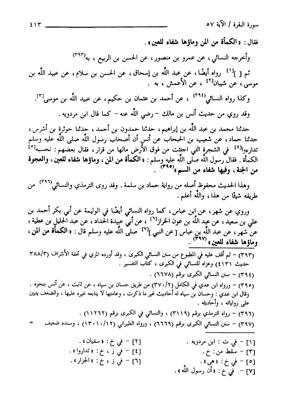 مَالِك رَضِيَ اللَّه عَنْهُ كَمَا قَالَ اِبْن مَرْدَوَيْهِ حَدَّثَنَا مُحَمَّد بْن عَبْد اللَّه بْن إِبْرَاهِيم حَدَّثَنَا حَمْدُون بْن أَحْمَد حَدَّثَنَا جُوَيْرَة بْن أَشْرَس حَدَّثَنَا حَمَّاد عَنْ شُعَيْب بْن الْحَجَّاب عَنْ أَنَس أَنَّ أَصْحَاب رَسُول اللَّه صَلَّى اللَّه عَلَيْهِ وَسَلَّمَ تَدَارَوْا فِي الشَّجَرَة الَّتِي اُجْتُثَّتْ مِنْ فَوْق الْأَرْض مَا لَهَا مِنْ قَرَار فَقَالَ بَعْضهمْ نَحْسِبهُ الْكَمْأَة فَقَالَ : رَسُول اللَّه صَلَّى اللَّه عَلَيْهِ وَسَلَّمَ " الْكَمْأَة مِنْ الْمَنّ وَمَاؤُهَا شِفَاء الْعَيْن وَالْعَجْوَة مِنْ الْجَنَّة وَفِيهَا شِفَاء مِنْ السُّمّ " وَهَذَا الْحَدِيث مَحْفُوظ أَصْله مِنْ رِوَايَة حَمَّاد بْن سَلَمَة وَقَدْ رَوَى التِّرْمِذِيّ وَالنَّسَائِيّ مِنْ طَرِيقه شَيْئًا مِنْ هَذَا وَاَللَّه أَعْلَم : وَرَوَى عَنْ شَهْر عَنْ اِبْن عَبَّاس كَمَا رَوَاهُ النَّسَائِيّ أَيْضًا فِي الْوَلِيمَة عَنْ أَبِي بَكْر أَحْمَد بْن عَلِيّ بْن سَعِيد عَنْ عَبْد اللَّه بْن عَوْن الْخَرَّاز عَنْ أَبِي عُبَيْدَة الْحَدَّاد عَنْ عَبْد الْجَلِيل بْن عَطِيَّة عَنْ عَبْد اللَّه بْن عَبَّاس عَنْ النَّبِيّ صَلَّى اللَّه عَلَيْهِ وَسَلَّمَ قَالَ " الْكَمْأَة مِنْ الْمَنّ وَمَاؤُهَا شِفَاء لِلْعَيْنِ "
