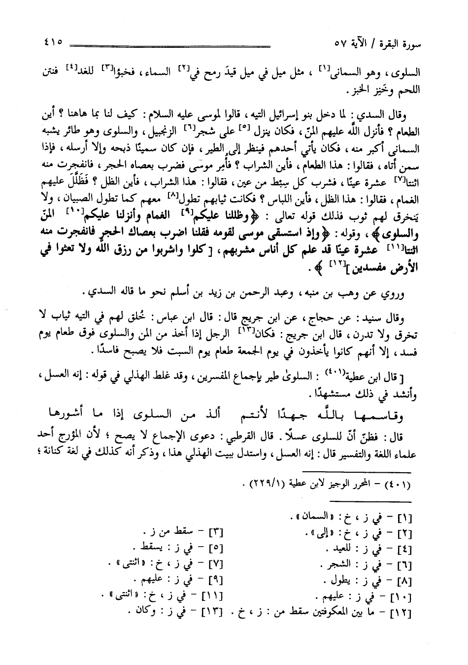 السَّلْوَى وَهُوَ السَّمَّانِيّ مِثْل مِيل فِي مِيل قِيدَ رُمْح فِي السَّمَاء فَخَبَّئُوا لِلْغَدِ فَنَتُنَ اللَّحْمُ وَخَنِزَ الْخُبْرُ وَقَالَ السُّدِّيّ لَمَّا دَخَلَ بَنُو إِسْرَائِيل التِّيه قَالُوا لِمُوسَى عَلَيْهِ السَّلَام كَيْف لَنَا بِمَا هَاهُنَا أَيْنَ الطَّعَام فَأَنْزَلَ اللَّه عَلَيْهِمْ الْمَنّ فَكَانَ يَنْزِل عَلَى شَجَر الزَّنْجَبِيل وَالسَّلْوَى وَهُوَ طَائِر يُشْبِه السَّمَّانِيّ أَكْبَر مِنْهُ فَكَانَ يَأْتِي أَحَدهمْ فَيَنْظُر إِلَى الطَّيْر فَإِنْ كَانَ سَمِينًا ذَبَحَهُ وَإِلَّا أَرْسَلَهُ فَإِذَا سَمِنَ أَتَاهُ فَقَالُوا هَذَا الطَّعَام فَأَيْنَ الشَّرَاب ؟ فَأَمَرَ مُوسَى فَضَرَبَ بِعَصَاهُ الْحَجَر فَانْفَجَرَتْ مِنْهُ اِثْنَتَا عَشْرَة عَيْنًا فَشَرِبَ كُلّ سَبْط مِنْ عَيْن فَقَالُوا هَذَا الشَّرَاب فَأَيْنَ الظِّلّ ؟ فَظُلِّلَ عَلَيْهِمْ الْغَمَام فَقَالُوا هَذَا الظِّلّ فَأَيْنَ اللِّبَاس ؟ فَكَانَتْ ثِيَابهمْ تَطُول مَعَهُمْ كَمَا يَطُول الصِّبْيَان وَلَا يَتَخَرَّق لَهُمْ ثَوْب فَذَلِكَ قَوْله تَعَالَى " وَظَلَّلْنَا عَلَيْهِمْ الْغَمَام وَأَنْزَلْنَا عَلَيْهِمْ الْمَنّ وَالسَّلْوَى " وَقَوْله " وَإِذْ اِسْتَسْقَى مُوسَى لِقَوْمِهِ فَقُلْنَا اِضْرِبْ بِعَصَاك الْحَجَر فَانْفَجَرَتْ مِنْهُ اِثْنَتَا عَشْرَة عَيْنًا قَدْ عَلِمَ كُلّ أُنَاس مَشْرَبهمْ كُلُوا وَاشْرَبُوا مِنْ رِزْق اللَّه وَلَا تَعْثَوْا فِي الْأَرْض مُفْسِدِينَ" وَرُوِيَ عَنْ وَهْب بْن مُنَبِّه وَعَبْد الرَّحْمَن بْن زَيْد بْن أَسْلَمَ نَحْو مَا قَالَهُ السُّدِّيّ وَقَالَ : سُنَيْد عَنْ حَجَّاج عَنْ اِبْن جُرَيْج قَالَ : قَالَ اِبْن عَبَّاس خَلَقَ لَهُمْ فِي التِّيه ثِيَاب لَا تُخْرَق وَلَا تَدْرَن قَالَ اِبْن جُرَيْج : فَكَانَ الرَّجُل إِذَا أَخَذَ مِنْ الْمَنّ وَالسَّلْوَى فَوْق طَعَام يَوْم فَسَدَ إِلَّا أَنَّهُمْ كَانُوا يَأْخُذُونَ فِي يَوْم الْجُمْعَة طَعَام يَوْم السَّبْت فَلَا يُصْبِح فَاسِدًا قَالَ : اِبْن عَطِيَّة السَّلْوَى طَيْر بِإِجْمَاعِ الْمُفَسِّرِينَ وَقَدْ غَلِطَ الْهُذَلِيّ فِي قَوْله إِنَّهُ الْعَسَل وَأَنْشَدَ فِي ذَلِكَ مُسْتَشْهِدًا :