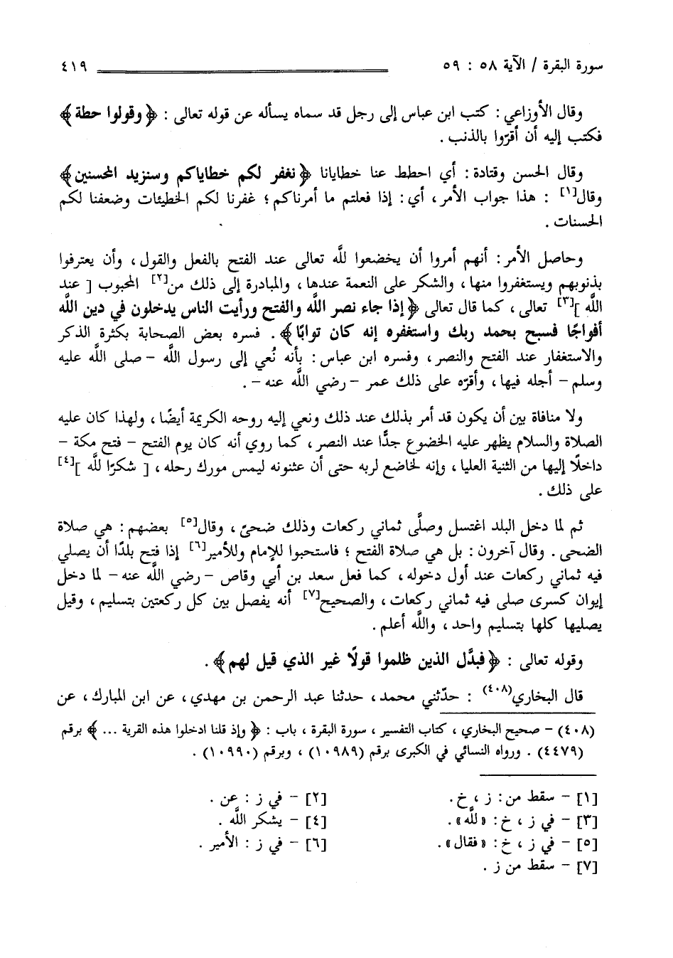 وَقَالَ الْأَوْزَاعِيّ. كَتَبَ اِبْن عَبَّاس إِلَى رَجُل قَدْ سَمَّاهُ فَسَأَلَهُ عَنْ قَوْله تَعَالَى " وَقُولُوا حِطَّة " فَكَتَبَ إِلَيْهِ أَنْ أَقِرُّوا بِالذَّنْبِ وَقَالَ : الْحَسَن وَقَتَادَة أَيْ اُحْطُطْ عَنَّا خَطَايَانَا " نَغْفِر لَكُمْ خَطَايَاكُمْ وَسَنَزِيدُ الْمُحْسِنِينَ " وَقَالَ هَذَا جَوَاب الْأَمْر أَيْ إِذَا فَعَلْتُمْ مَا أَمَرْنَاكُمْ غَفَرْنَا لَكُمْ الْخَطِيئَات وَضَعَّفْنَا لَكُمْ الْحَسَنَات وَحَاصِل الْأَمْر أَنَّهُمْ أُمِرُوا أَنْ يَخْضَعُوا لِلَّهِ تَعَالَى عِنْد الْفَتْح بِالْفِعْلِ وَالْقَوْل وَأَنْ يَعْتَرِفُوا بِذُنُوبِهِمْ وَيَسْتَغْفِرُوا مِنْهَا وَالشُّكْر عَلَى النِّعْمَة عِنْدهَا وَالْمُبَادَرَة إِلَى ذَلِكَ مِنْ الْمَحْبُوب عِنْد اللَّه تَعَالَى " إِذَا جَاءَ نَصْر اللَّه وَالْفَتْح وَرَأَيْت النَّاس يَدْخُلُونَ فِي دِين اللَّه أَفْوَاجًا فَسَبِّحْ بِحَمْدِ رَبّك وَاسْتَغْفِرْهُ إِنَّهُ كَانَ تَوَّابًا " فَسَّرَهُ بَعْض الصَّحَابَة بِكَثْرَةِ الذِّكْر وَالِاسْتِغْفَار عِنْد الْفَتْح وَالنَّصْر وَفَسَّرَهُ اِبْن عَبَّاس بِأَنَّهُ نُعِيَ إِلَى رَسُول اللَّه صَلَّى اللَّه عَلَيْهِ وَسَلَّمَ أَجَله فِيهَا وَأَقَرَّهُ عَلَى ذَلِكَ عُمَر رَضِيَ اللَّه عَنْهُ وَلَا مُنَافَاة بَيْن أَنْ يَكُون قَدْ أُمِرَ بِذَلِكَ عِنْد ذَلِكَ وَنُعِيَ إِلَيْهِ رُوحه الْكَرِيمَة أَيْضًا وَلِهَذَا كَانَ عَلَيْهِ الصَّلَاة وَالسَّلَام يَظْهَر عَلَيْهِ الْخُضُوع جِدًّا عِنْد النَّصْر كَمَا رُوِيَ أَنَّهُ كَانَ يَوْم الْفَتْح فَتْح مَكَّة دَاخِلًا إِلَيْهَا مِنْ الثَّنِيَّة الْعُلْيَا وَإِنَّهُ لَخَاضِع لِرَبِّهِ حَتَّى أَنَّ عُثْنُونه لَيَمَسّ مَوْرِك رَحْله شُكْرًا لِلَّهِ عَلَى ذَلِكَ ثُمَّ لَمَّا دَخَلَ الْبَلَد اِغْتَسَلَ وَصَلَّى ثَمَانِي رَكَعَات وَذَلِكَ ضُحًى وَقَالَ : بَعْضهمْ هَذِهِ صَلَاة الضُّحَى وَقَالَ : آخَرُونَ بَلْ هِيَ صَلَاة الْفَتْح فَاسْتَحَبُّوا لِلْإِمَامِ وَلِلْأَمِيرِ إِذَا فَتَحَ بَلَدًا أَنْ يُصَلِّي فِيهِ ثَمَانِي رَكَعَات عِنْد أَوَّل دُخُوله كَمَا فَعَلَ سَعْد بْن أَبِي وَقَّاص رَضِيَ اللَّه عَنْهُ لَمَّا دَخَلَ إِيوَان كِسْرَى صَلَّى فِيهِ ثَمَانِي رَكَعَات وَالصَّحِيح أَنَّهُ يَفْصِل بَيْن كُلّ رَكْعَتَيْنِ بِتَسْلِيمٍ وَقِيلَ يُصَلِّيهَا كُلّهَا بِتَسْلِيمٍ وَاحِد وَاَللَّه أَعْلَم .