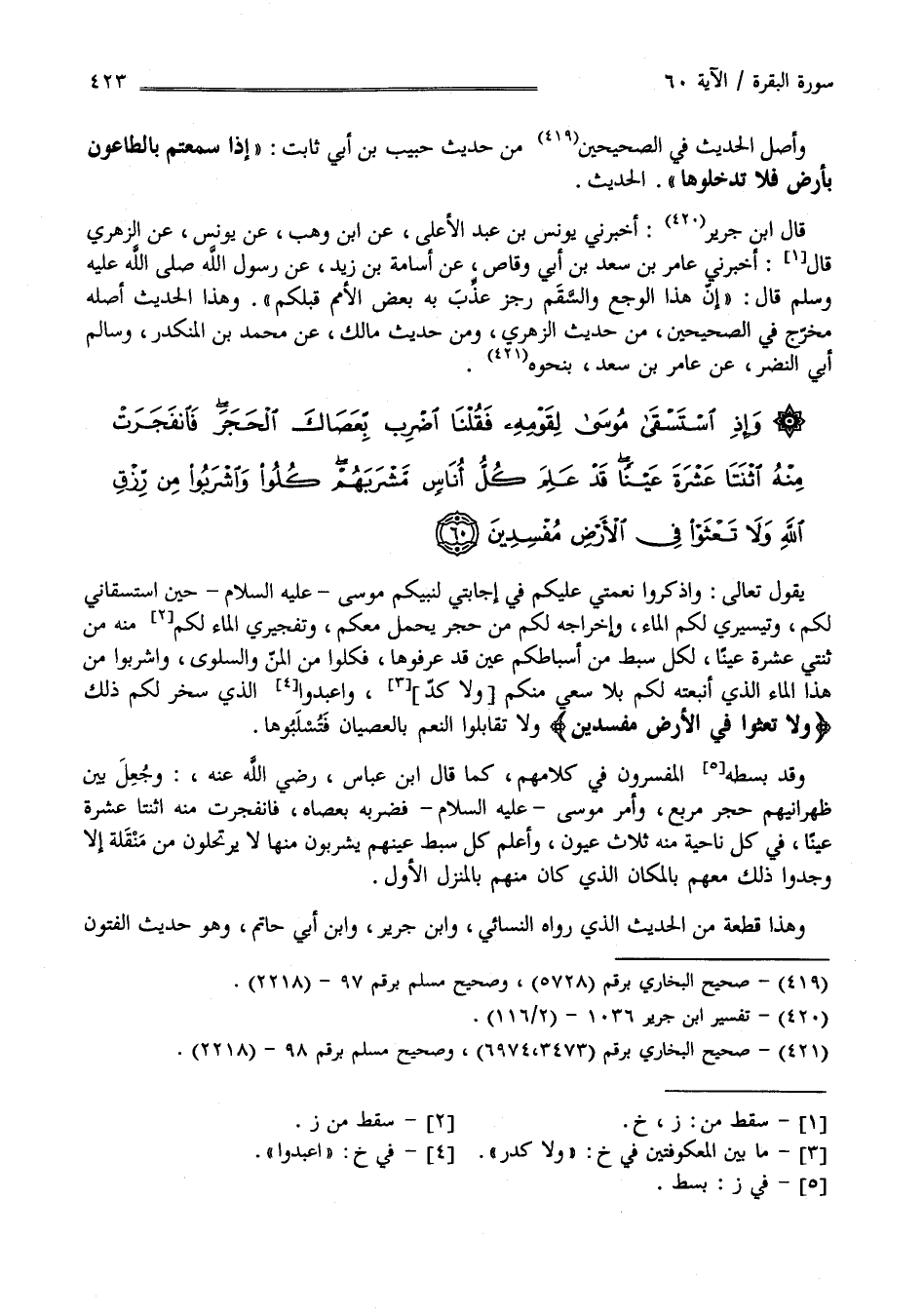 وَإِذِ اسْتَسْقَى مُوسَى لِقَوْمِهِ فَقُلْنَا اضْرِبْ بِعَصَاكَ الْحَجَرَ فَانْفَجَرَتْ مِنْهُ اثْنَتَا عَشْرَةَ عَيْنًا قَدْ عَلِمَ كُلُّ أُنَاسٍ مَشْرَبَهُمْ كُلُوا وَاشْرَبُوا مِنْ رِزْقِ اللَّهِ وَلَا تَعْثَوْا فِي الْأَرْضِ مُفْسِدِينَ (60)