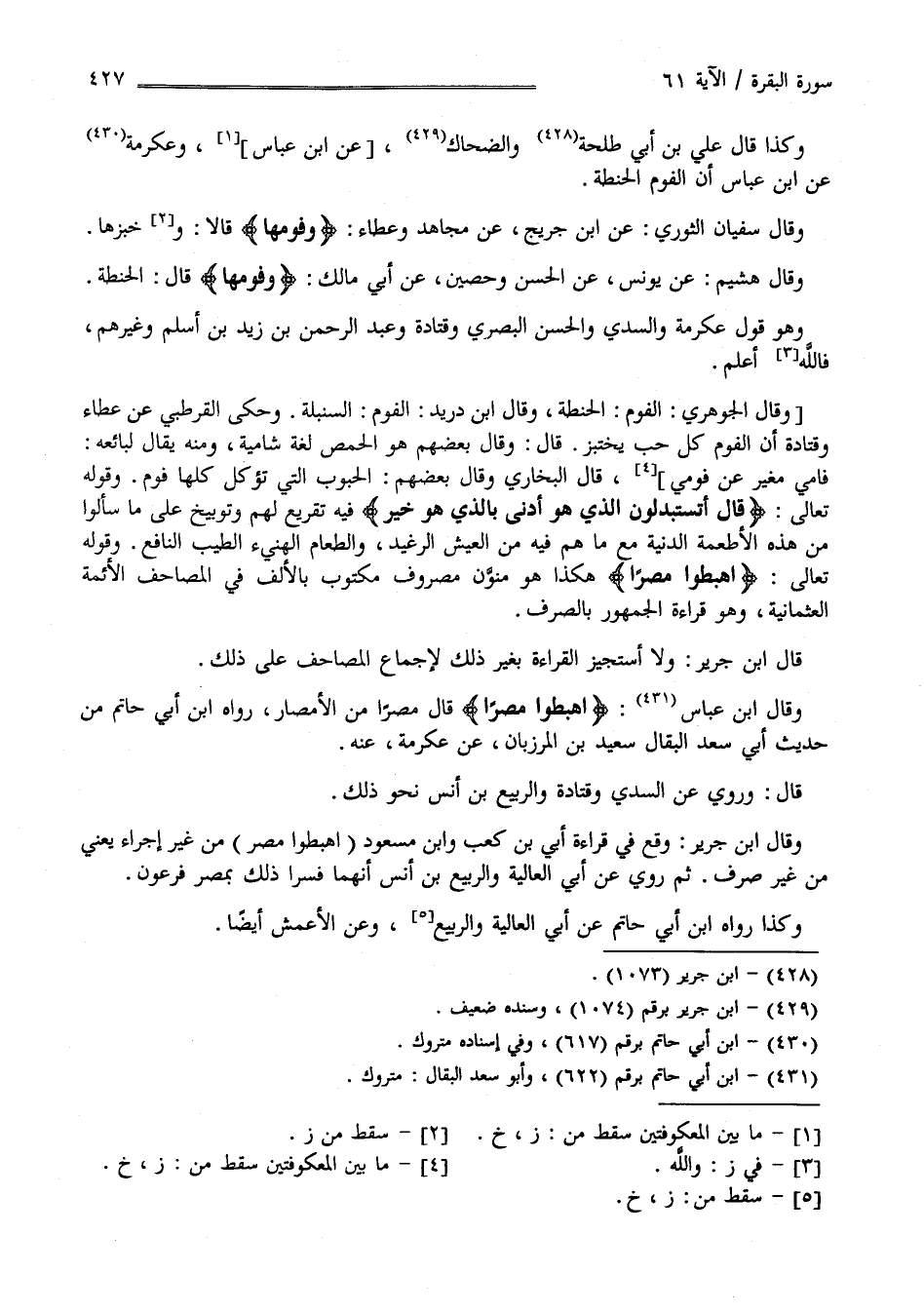 قَالَ اِبْن جَرِير : وَلَا أَسْتَجِيزُ الْقِرَاءَة بِغَيْرِ ذَلِكَ لِإِجْمَاعِ الْمَصَاحِف عَلَى ذَلِكَ : وَقَالَ اِبْن عَبَّاس" اِهْبِطُوا مِصْرًا " مِنْ الْأَمْصَار رَوَاهُ اِبْن أَبِي حَاتِم مِنْ حَدِيث أَبِي سَعِيد الْبَقَّال سَعِيد بْن الْمَرْزُبَان عَنْ عِكْرِمَة عَنْهُ قَالَ : وَرُوِيَ عَنْ السُّدِّيّ وَقَتَادَة وَالرَّبِيع بْن أَنَس نَحْو ذَلِكَ وَقَالَ اِبْن جَرِير وَقَعَ فِي قِرَاءَة أُبَيّ بْن كَعْب وَابْن مَسْعُود " اِهْبِطُوا مِصْر " مِنْ غَيْر إِجْرَاء يَعْنِي مِنْ غَيْر صَرْف ثُمَّ رَوَى عَنْ أَبِي الْعَالِيَة وَالرَّبِيع بْن أَنَس أَنَّهُمَا فَسَّرَا ذَلِكَ بِمِصْرَ فِرْعَوْن وَكَذَا رَوَاهُ اِبْن أَبِي حَاتِم عَنْ أَبِي الْعَالِيَة وَالرَّبِيع وَعَنْ الْأَعْمَش أَيْضًا .