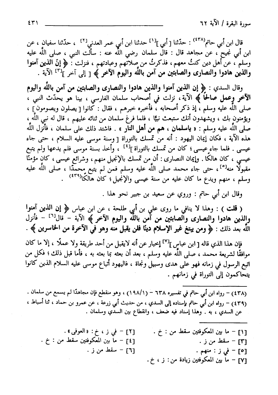 قَالَ اِبْن أَبِي حَاتِم حَدَّثَنَا أَبِي حَدَّثَنَا عُمَر بْن أَبِي عُمَر الْعَدَوِيّ حَدَّثَنَا سُفْيَان عَنْ اِبْن أَبِي نَجِيح عَنْ مُجَاهِد قَالَ : قَالَ سَلْمَان رَضِيَ اللَّه عَنْهُ سَأَلْت النَّبِيّ صَلَّى اللَّه عَلَيْهِ وَسَلَّمَ عَنْ أَهْل دِين كُنْت مَعَهُمْ فَذَكَرْت مِنْ صَلَاتهمْ وَعِبَادَتهمْ فَنَزَلَتْ " إِنَّ الَّذِينَ آمَنُوا وَاَلَّذِينَ هَادُوا وَالنَّصَارَى وَالصَّابِئِينَ مَنْ آمَنَ بِاَللَّهِ وَالْيَوْم الْآخِر " الْآيَة وَقَالَ السُّدِّيّ إِنَّ " الَّذِينَ آمَنُوا وَاَلَّذِينَ هَادُوا وَالنَّصَارَى وَالصَّابِئِينَ مَنْ آمَنَ بِاَللَّهِ وَالْيَوْم الْآخِر وَعَمِلَ صَالِحًا " الْآيَة نَزَلَتْ فِي أَصْحَاب سَلْمَان الْفَارِسِيّ بَيْنَا هُوَ يُحَدِّث النَّبِيّ صَلَّى اللَّه عَلَيْهِ وَسَلَّمَ إِذْ ذَكَرَ أَصْحَابه فَأَخْبَرَهُ خَبَرهمْ فَقَالَ : كَانُوا يُصَلُّونَ وَيَصُومُونَ وَيُؤْمِنُونَ بِك وَيَشْهَدُونَ أَنَّك سَتُبْعَثُ نَبِيًّا فَلَمَّا فَرَغَ سَلْمَان مِنْ ثَنَائِهِ عَلَيْهِمْ قَالَ لَهُ نَبِيّ اللَّه صَلَّى اللَّه عَلَيْهِ وَسَلَّمَ " يَا سَلْمَان مِنْ أَهْل النَّار " فَاشْتَدَّ ذَلِكَ عَلَى سَلْمَان فَأَنْزَلَ اللَّه هَذِهِ الْآيَة فَكَانَ إِيمَان الْيَهُود أَنَّهُ مَنْ تَمَسَّكَ بِالتَّوْرَاةِ وَسُنَّة مُوسَى عَلَيْهِ السَّلَام حَتَّى جَاءَ عِيسَى فَلَمَّا جَاءَ عِيسَى كَانَ مَنْ تَمَسَّكَ بِالتَّوْرَاةِ وَأَخَذَ بِسُنَّةِ مُوسَى فَلَمْ يَدَعهَا وَلَمْ يَتْبَع عِيسَى كَانَ هَالِكًا وَإِيمَان النَّصَارَى أَنَّ مَنْ تَمَسَّكَ بِالْإِنْجِيلِ مِنْهُمْ وَشَرَائِع عِيسَى كَانَ مُؤْمِنًا مَقْبُولًا مِنْهُ حَتَّى جَاءَ مُحَمَّد صَلَّى اللَّه عَلَيْهِ وَسَلَّمَ فَمَنْ لَمْ يَتَّبِع مُحَمَّدًا صَلَّى اللَّه عَلَيْهِ وَسَلَّمَ مِنْهُمْ وَيَدَع مَا كَانَ عَلَيْهِ مِنْ سُنَّة عِيسَى وَالْإِنْجِيل كَانَ هَالِكًا .