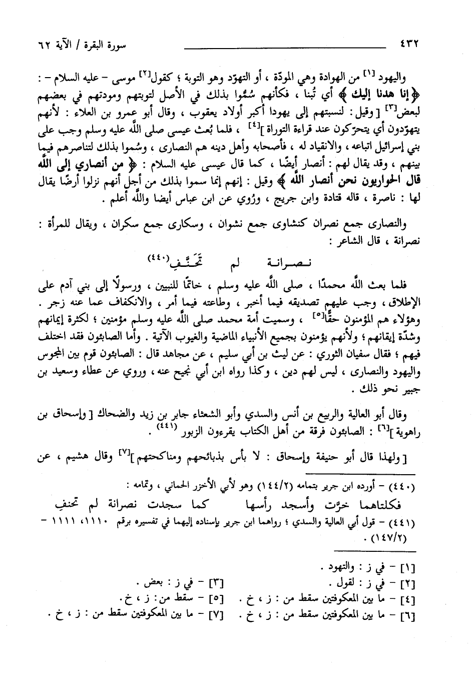 فَلَمَّا بَعَثَ اللَّه مُحَمَّدًا صَلَّى اللَّه عَلَيْهِ وَسَلَّمَ خَاتَمًا لِلنَّبِيِّينَ وَرَسُولًا إِلَى بَنِي آدَم عَلَى الْإِطْلَاق وَجَبَ عَلَيْهِمْ تَصْدِيقه فِيمَا أَخْبَرَ وَطَاعَته فِيمَا أَمَرَ وَالِانْكِفَاف عَمَّا عَنْهُ زَجَرَ وَهَؤُلَاءِ هُمْ الْمُؤْمِنُونَ حَقًّا وَسُمِّيَتْ أُمَّة مُحَمَّد صَلَّى اللَّه عَلَيْهِ وَسَلَّمَ مُؤْمِنِينَ لِكَثْرَةِ إِيمَانهمْ وَشِدَّة إِيقَانهمْ وَلِأَنَّهُمْ يُؤْمِنُونَ بِجَمِيعِ الْأَنْبِيَاء الْمَاضِيَة وَالْغُيُوب الْآتِيَة وَأَمَّا الصَّابِئِينَ فَقَدْ اُخْتُلِفَ فِيهِمْ فَقَالَ سُفْيَان الثَّوْرِيّ عَنْ لَيْث بْن أَبِي سُلَيْم عَنْ مُجَاهِد قَالَ الصَّابِئُونَ قَوْم بَيْن الْمَجُوس وَالْيَهُود وَالنَّصَارَى لَيْسَ لَهُمْ دِين وَكَذَا رَوَاهُ اِبْن أَبِي نَجِيح عَنْهُ .