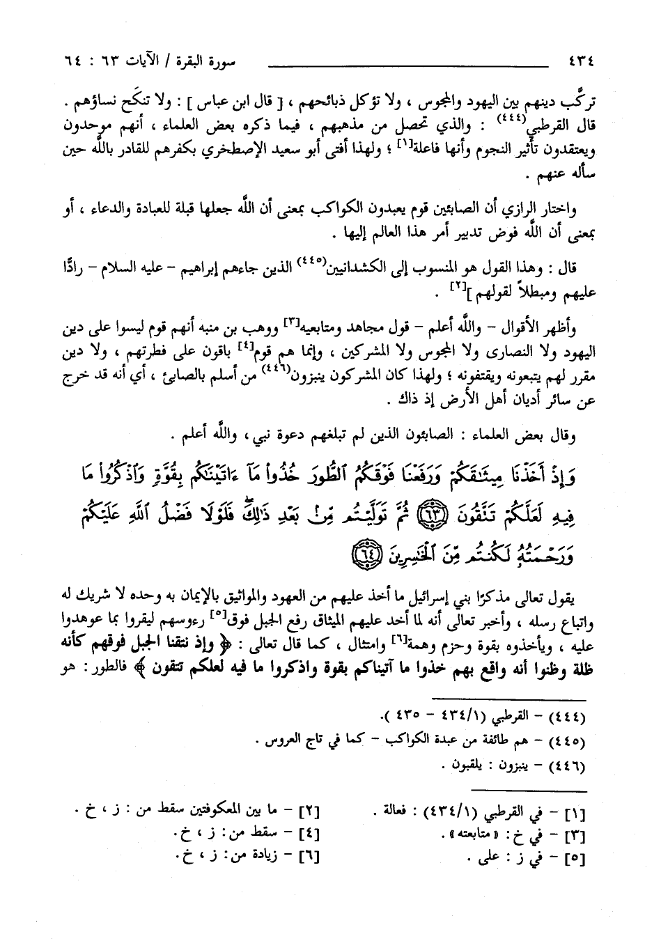 تَرَكَّبَ دِينهمْ بَيْن الْيَهُود وَالْمَجُوس وَلَا تُؤْكَل ذَبَائِحهمْ وَلَا تُنْكَح نِسَاؤُهُمْ قَالَ الْقُرْطُبِيّ : وَاَلَّذِي تَحَصَّلَ مِنْ مَذْهَبهمْ فِيمَا ذَكَرَهُ بَعْض الْعُلَمَاء أَنَّهُمْ مُوَحِّدُونَ وَيَعْتَقِدُونَ تَأْثِير النُّجُوم وَأَنَّهُمْ فَاعِلَة وَلِهَذَا أَفْتَى أَبُو سَعِيد الْإِصْطَخْرِيّ بِكُفْرِهِمْ لِلْقَادِرِ بِاَللَّهِ حِين سَأَلَهُ عَنْهُمْ وَاخْتَارَ الرَّازِيّ أَنَّ الصَّابِئِينَ قَوْم يَعْبُدُونَ الْكَوَاكِب بِمَعْنَى أَنَّ اللَّه جَعَلَهَا قِبْلَة لِلْعِبَادَةِ وَالدُّعَاء أَوْ بِمَعْنَى أَنَّ اللَّه فَوَّضَ تَدْبِير أَمْر هَذَا الْعَالَم إِلَيْهَا قَالَ : وَهَذَا الْقَوْل هُوَ الْمَنْسُوب إِلَى الكشرانيين الَّذِينَ جَاءَهُمْ إِبْرَاهِيم عَلَيْهِ السَّلَام رَادًّا عَلَيْهِمْ وَمُبْطِلًا لِقَوْلِهِمْ وَأَظْهَرُ الْأَقْوَال - وَاَللَّهُ أَعْلَمُ - قَوْلُ مُجَاهِد وَمُتَابِعِيهِ وَوَهْب بْن مُنَبِّه أَنَّهُمْ قَوْم لَيْسُوا عَلَى دِين الْيَهُود وَلَا النَّصَارَى وَلَا الْمَجُوس وَلَا الْمُشْرِكِينَ وَإِنَّمَا هُمْ قَوْم بَاقُونَ عَلَى فِطْرَتهمْ وَلَا دِين مُقَرَّر لَهُمْ يَتَّبِعُونَهُ وَيَقْتَفُونَهُ .