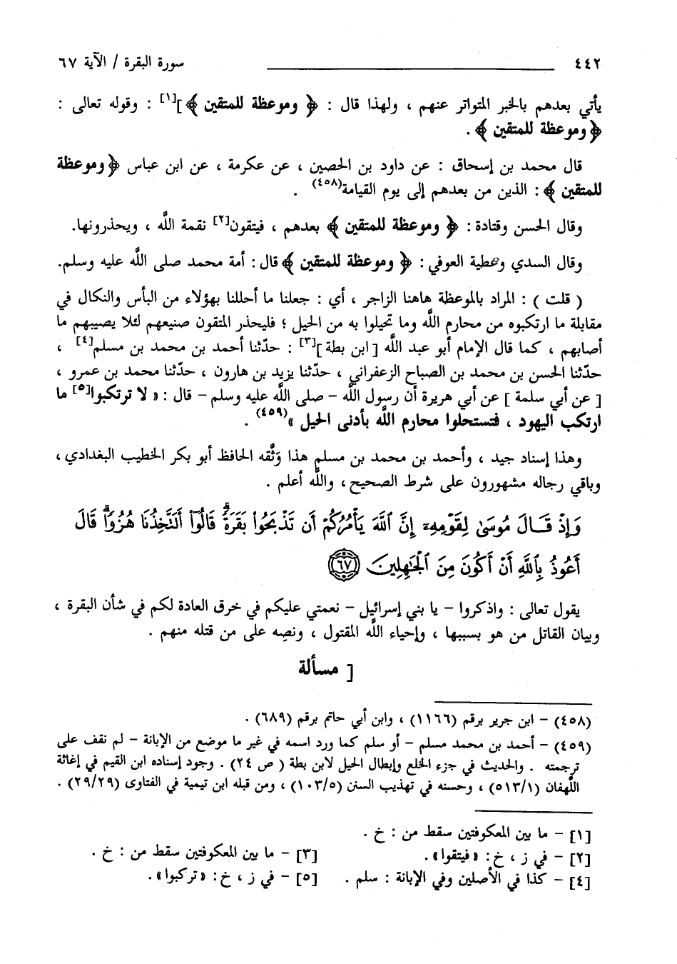 وَإِذْ قَالَ مُوسَى لِقَوْمِهِ إِنَّ اللَّهَ يَأْمُرُكُمْ أَنْ تَذْبَحُوا بَقَرَةً قَالُوا أَتَتَّخِذُنَا هُزُوًا قَالَ أَعُوذُ بِاللَّهِ أَنْ أَكُونَ مِنَ الْجَاهِلِينَ (67)