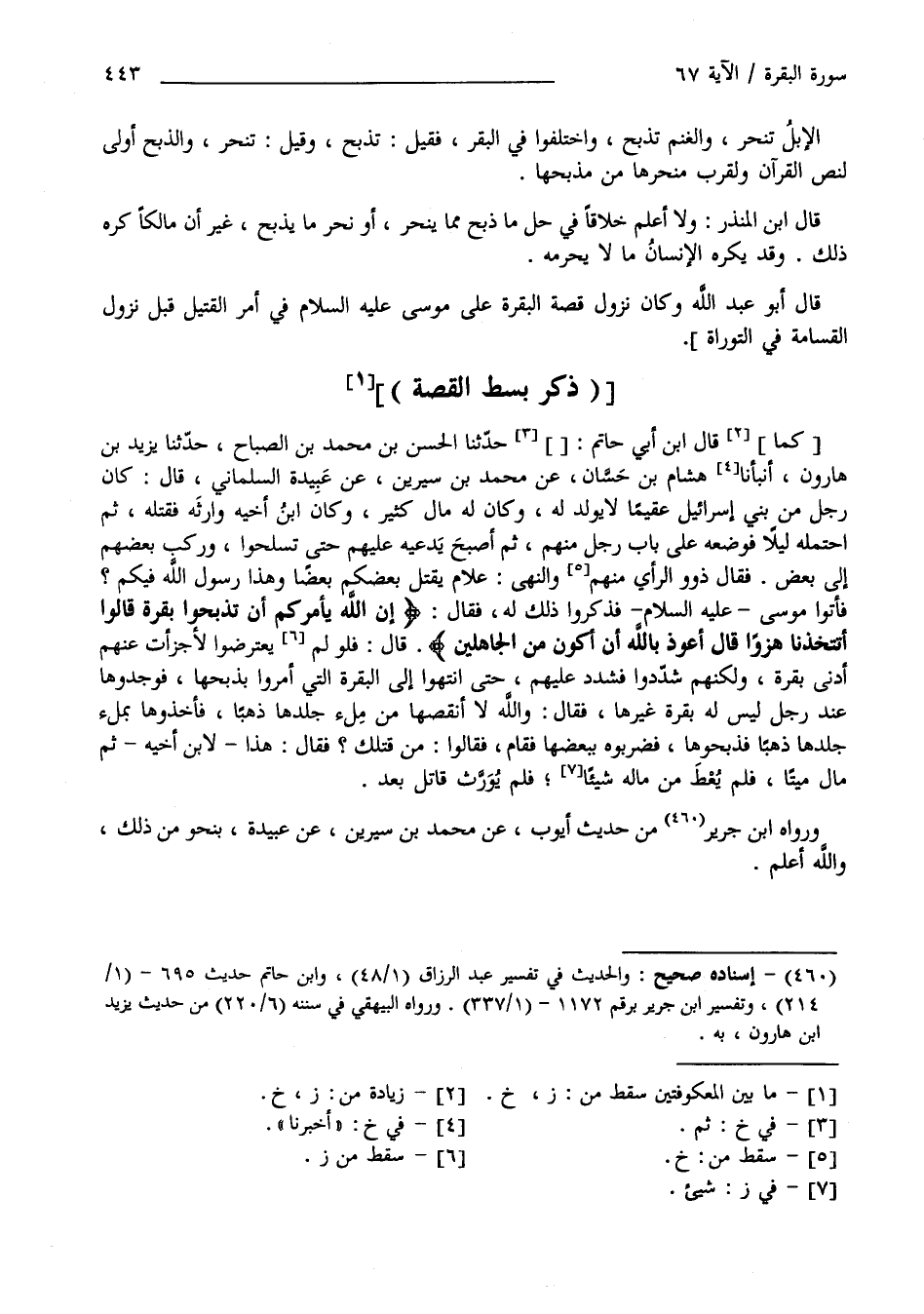 " ذِكْرُ بَسْط الْقِصَّة" قَالَ اِبْن أَبِي حَاتِم : حَدَّثَنَا الْحَسَن بْن مُحَمَّد بْن الصَّبَّاح حَدَّثَنَا يَزِيد بْن هَارُونَ أَنْبَأَنَا هِشَام بْن حَسَّان عَنْ مُحَمَّد بْن سِيرِينَ عَنْ عَبِيدَة السَّلْمَانِيّ قَالَ : كَانَ رَجُل مِنْ بَنِي إِسْرَائِيل عَقِيمًا لَا يُولَد لَهُ وَكَانَ لَهُ مَالٌ كَثِيرٌ وَكَانَ اِبْن أَخِيهِ وَارِثه فَقَتَلَهُ ثُمَّ اِحْتَمَلَهُ لَيْلًا فَوَضَعَهُ عَلَى بَاب رَجُل مِنْهُمْ ثُمَّ أَصْبَحَ يَدَّعِيه عَلَيْهِمْ حَتَّى تَسَلَّحُوا وَرَكِبَ بَعْضُهُمْ عَلَى بَعْض .