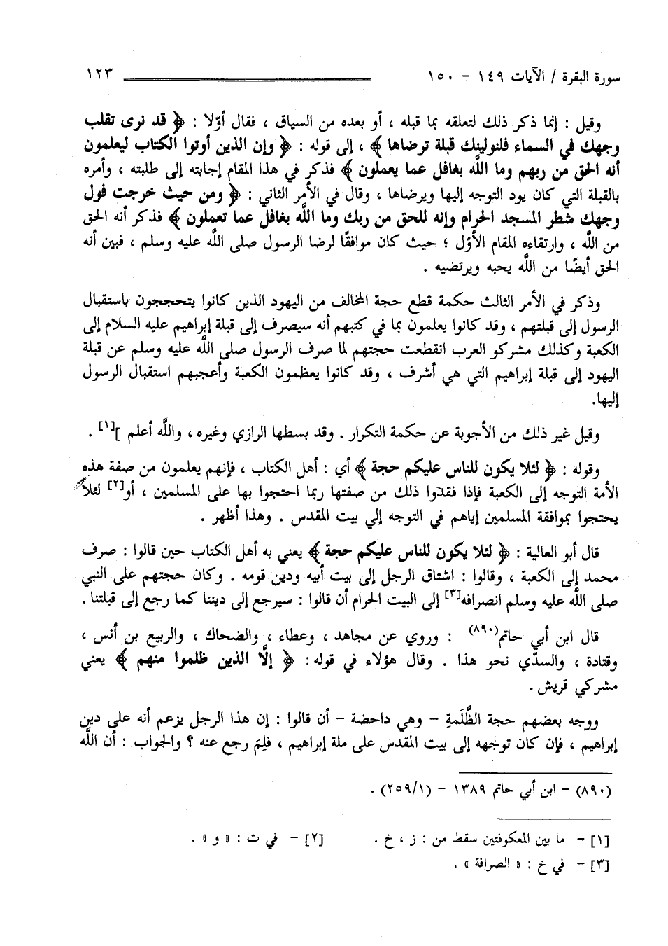 قَالَ فِي الْأَمْر الثَّانِي " وَمِنْ حَيْثُ خَرَجْت فَوَلِّ وَجْهك شَطْر الْمَسْجِد الْحَرَام وَإِنَّهُ لَلْحَقُّ مِنْ رَبّك وَمَا اللَّهُ بِغَافِلٍ عَمَّا تَعْمَلُونَ " فَذَكَرَ أَنَّهُ الْحَقُّ مِنْ اللَّه وَارْتِقَاءَهُ الْمَقَام الْأَوَّل حَيْثُ كَانَ مُوَافِقًا لِرِضَا الرَّسُول صَلَّى اللَّه عَلَيْهِ وَسَلَّمَ فَبَيَّنَ أَنَّهُ الْحَقّ أَيْضًا مِنْ اللَّه يُحِبُّهُ وَيَرْتَضِيه وَذَكَرَ فِي الْأَمْر الثَّالِث حِكْمَة قَطْع حُجَّة الْمُخَالِف مِنْ الْيَهُود الَّذِينَ كَانُوا يَتَحَجَّجُونَ بِاسْتِقْبَالِ الرَّسُول إِلَى قِبْلَتهمْ وَقَدْ كَانُوا يَعْلَمُونَ بِمَا فِي كُتُبهمْ أَنَّهُ سَيُصْرَفُ إِلَى قِبْلَة إِبْرَاهِيم عَلَيْهِ السَّلَام إِلَى الْكَعْبَة وَكَذَلِكَ مُشْرِكُو الْعَرَب اِنْقَطَعَتْ حُجَّتهمْ لَمَّا صُرِفَ الرَّسُول صَلَّى اللَّه عَلَيْهِ وَسَلَّمَ عَنْ قِبْلَة إِبْرَاهِيم الَّتِي هِيَ أَشْرَف وَقَدْ كَانُوا يُعَظِّمُونَ الْكَعْبَة وَأَعْجَبَهُمْ اِسْتِقْبَال الرَّسُول إِلَيْهَا وَقِيلَ غَيْر ذَلِكَ مِنْ الْأَجْوِبَة عَنْ حِكْمَة التَّكْرَار وَقَدْ بَسَطَهَا الرَّازِيّ وَغَيْره وَاَللَّه أَعْلَم : وَقَوْله " لِئَلَّا يَكُون لِلنَّاسِ عَلَيْكُمْ حُجَّة " أَيْ أَهْل الْكِتَاب فَإِنَّهُمْ يَعْلَمُونَ مِنْ صِفَة هَذِهِ الْأُمَّة التَّوَجُّه إِلَى الْكَعْبَة فَإِذَا فَقَدُوا ذَلِكَ مِنْ صِفَتهَا رُبَّمَا اِحْتَجُّوا بِهَا عَلَى الْمُسْلِمِينَ وَلِئَلَّا يَحْتَجُّوا بِمُوَافَقَةِ الْمُسْلِمِينَ إِيَّاهُمْ فِي التَّوَجُّه إِلَى بَيْت الْمَقْدِس وَهَذَا أَظْهَر قَالَ أَبُو الْعَالِيَة " لِئَلَّا يَكُون لِلنَّاسِ عَلَيْكُمْ حُجَّة " يَعْنِي بِهِ أَهْل الْكِتَاب حِين قَالُوا صُرِفَ مُحَمَّد إِلَى الْكَعْبَة : وَقَالُوا اِشْتَاقَ الرَّجُل إِلَى بَيْت أَبِيهِ وَدِين قَوْمه وَكَانَ حُجَّتهمْ عَلَى النَّبِيّ صَلَّى اللَّه عَلَيْهِ وَسَلَّمَ اِنْصِرَافه إِلَى الْبَيْت الْحَرَام أَنْ قَالُوا سَيَرْجِعُ إِلَى دِيننَا كَمَا رَجَعَ إِلَى قِبْلَتنَا قَالَ اِبْن أَبِي حَاتِم وَرَوَى عَنْ مُجَاهِد وَعَطَاء وَالضَّحَّاك وَالرَّبِيع بْن أَنَس وَقَتَادَة وَالسُّدِّيّ نَحْو هَذَا وَقَالَ هَؤُلَاءِ فِي قَوْله " إِلَّا الَّذِينَ ظَلَمُوا مِنْهُمْ " يَعْنِي مُشْرِكِي قُرَيْش وَوَجَّهَ بَعْضهمْ حُجَّة الظَّلَمَة وَهِيَ دَاحِضَة أَنْ قَالُوا إِنَّ هَذَا الرَّجُل يَزْعُم أَنَّهُ عَلَى دِين إِبْرَاهِيم فَإِنْ كَانَ تَوَجُّهه إِلَى بَيْت الْمَقْدِس عَلَى مِلَّة إِبْرَاهِيم فَلِمَ رَجَعَ عَنْهُ وَالْجَوَاب أَنَّ اللَّه