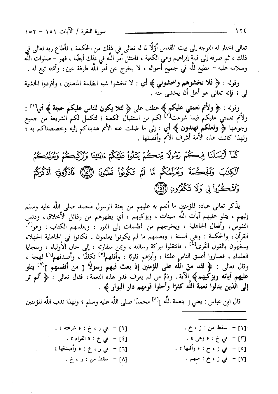 تَعَالَى اِخْتَارَ لَهُ التَّوَجُّه إِلَى الْبَيْت الْمَقْدِس أَوَّلًا لِمَا لَهُ تَعَالَى فِي ذَلِكَ مِنْ الْحِكْمَة فَأَطَاعَ رَبّه تَعَالَى فِي ذَلِكَ ثُمَّ صَرَفَهُ إِلَى قِبْلَة إِبْرَاهِيم وَهِيَ الْكَعْبَة فَامْتَثَلَ أَمْر اللَّه فِي ذَلِكَ أَيْضًا فَهُوَ صَلَوَات اللَّه وَسَلَامه عَلَيْهِ مُطِيع لِلَّهِ فِي جَمِيع أَحْوَاله لَا يَخْرُج عَنْ أَمْر اللَّه طَرْفَة عَيْن وَأُمَّته تَبَعٌ لَهُ وَقَوْله " فَلَا تَخْشَوْهُمْ وَاخْشَوْنِي" أَيْ لَا تَخْشَوْا شُبَه الظَّلَمَة الْمُتَعَنِّتِينَ وَأَفْرِدُوا الْخَشْيَة لِي فَإِنَّهُ تَعَالَى هُوَ أَهْل أَنْ يُخْشَى مِنْهُ : وَقَوْله " وَلِأُتِمَّ نِعْمَتِي عَلَيْكُمْ " عَطْف عَلَى لِئَلَّا يَكُون لِلنَّاسِ عَلَيْكُمْ حُجَّة أَيْ لِأُتِمّ نِعْمَتِي عَلَيْكُمْ فِيمَا شَرَعْت لَكُمْ مِنْ