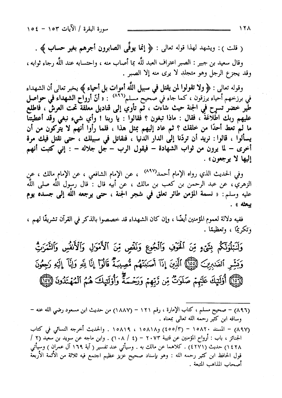 وَقَوْله تَعَالَى " وَلَا تَقُولُوا لِمَنْ يُقْتَلُ فِي سَبِيلِ اللَّهِ أَمْوَاتٌ بَلْ أَحْيَاءٌ " يُخْبِر تَعَالَى أَنَّ الشُّهَدَاء فِي بَرْزَخهمْ أَحْيَاء يُرْزَقُونَ كَمَا جَاءَ فِي صَحِيح مُسْلِم " إِنَّ أَرْوَاح الشُّهَدَاء فِي حَوَاصِل طُيُور خُضْر تَسْرَح فِي الْجَنَّة حَيْثُ شَاءَتْ ثُمَّ تَأْوِي إِلَى قَنَادِيل مُعَلَّقَة تَحْت الْعَرْش فَاطَّلَعَ عَلَيْهِمْ رَبُّك اِطِّلَاعَة فَقَالَ مَاذَا تَبْغُونَ ؟ فَقَالُوا يَا رَبّنَا وَأَيّ شَيْء نَبْغِي وَقَدْ أَعْطَيْتنَا مَا لَمْ تُعْطِ أَحَدًا مِنْ خَلْقك ؟ ثُمَّ عَادَ عَلَيْهِمْ بِمِثْلِ هَذَا فَلَمَّا رَأَوْا أَنَّهُمْ لَا يَتْرُكُونَ مِنْ أَنْ يَسْأَلُوا قَالُوا نُرِيد أَنْ تَرُدّنَا إِلَى الدَّار الدُّنْيَا فَنُقَاتِل فِي سَبِيلك حَتَّى نُقْتَل فِيك مَرَّة أُخْرَى - لِمَا يَرَوْنَ مِنْ ثَوَاب الشَّهَادَة - فَيَقُول الرَّبّ جَلَّ جَلَالُهُ" إِنِّي كَتَبْت أَنَّهُمْ إِلَيْهَا لَا يَرْجِعُونَ " .