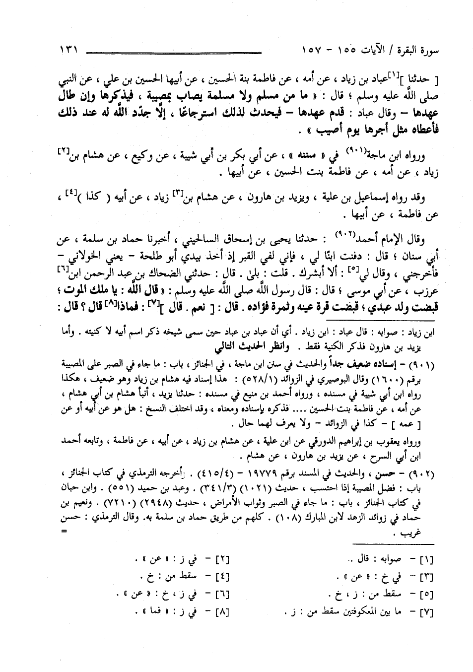 ذَلِكَ فَأَعْطَاهُ مِثْل أَجْرهَا يَوْم أُصِيبَ " وَرَوَاهُ اِبْن مَاجَهْ فِي سُنَنه عَنْ أَبِي بَكْر بْن أَبِي شَيْبَة عَنْ وَكِيع عَنْ هِشَام بْن زِيَاد عَنْ أُمّه عَنْ فَاطِمَة بِنْت الْحُسَيْن عَنْ أَبِيهَا وَقَدْ رَوَاهُ إِسْمَاعِيل بْن عُلَيَّة وَيَزِيد بْن هَارُونَ عَنْ هِشَام بْن زِيَاد عَنْ أَبِيهِ" كَذَا " عَنْ فَاطِمَة عَنْ أَبِيهَا وَقَالَ الْإِمَام أَحْمَد أَنَا يَحْيَى بْن إِسْحَاق السَّيْلَحِينِيّ أَنَا حَمَّاد بْن سَلَمَة عَنْ أَبِي سِنَان قَالَ : دَفَنْت اِبْنًا لِي فَإِنِّي لَفِي الْقَبْر إِذْ أَخَذَ بِيَدَيَّ أَبُو طَلْحَة يَعْنِي الْخَوْلَانِيّ فَأَخْرَجَنِي وَقَالَ لِي : أَلَا أُبَشِّرك قُلْت بَلَى قَالَ : حَدَّثَنِي الضَّحَّاك بْن عَبْد الرَّحْمَن بْن عَازِب عَنْ أَبِي مُوسَى قَالَ : قَالَ رَسُول اللَّه صَلَّى اللَّه عَلَيْهِ وَسَلَّمَ " قَالَ اللَّه : يَا مَلَك الْمَوْت قَبَضْت وَلَد عَبْدِي ; قَبَضْت قُرَّة عَيْنه وَثَمَرَة فُؤَاده ؟ قَالَ نَعَمْ قَالَ فَمَا قَالَ ؟ قَالَ :