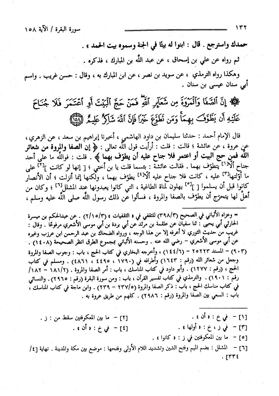 إِنَّ الصَّفَا وَالْمَرْوَةَ مِنْ شَعَائِرِ اللَّهِ فَمَنْ حَجَّ الْبَيْتَ أَوِ اعْتَمَرَ فَلَا جُنَاحَ عَلَيْهِ أَنْ يَطَّوَّفَ بِهِمَا وَمَنْ تَطَوَّعَ خَيْرًا فَإِنَّ اللَّهَ شَاكِرٌ عَلِيمٌ (158)