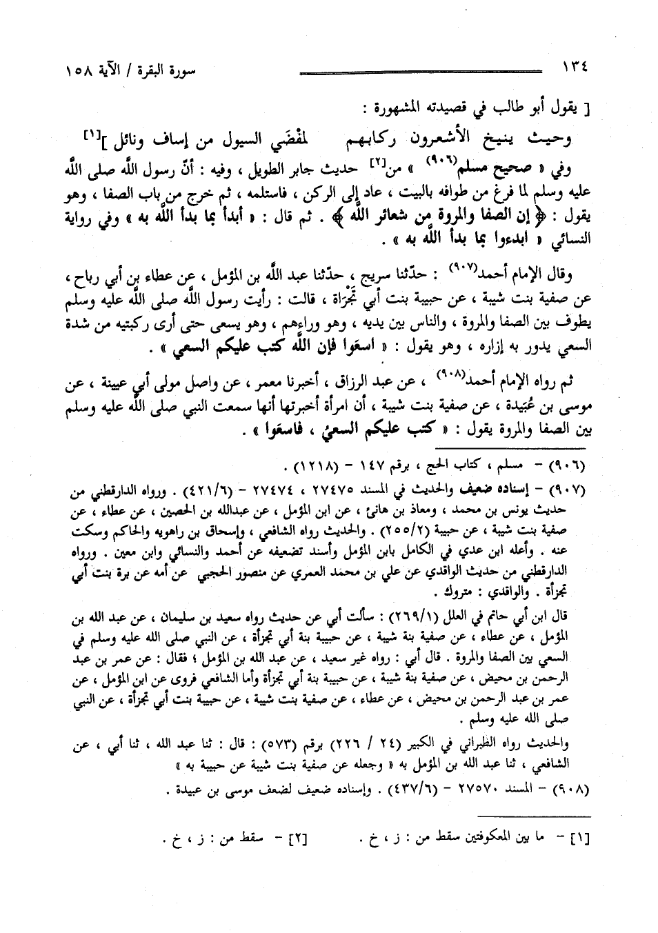 وَفِي صَحِيح مُسْلِم مِنْ حَدِيث جَابِر الطَّوِيل وَفِيهِ أَنَّ رَسُول اللَّه صَلَّى اللَّه عَلَيْهِ وَسَلَّمَ لَمَّا فَرَغَ مِنْ طَوَافه بِالْبَيْتِ عَادَ إِلَى الرُّكْن فَاسْتَلَمَهُ ثُمَّ خَرَجَ مِنْ بَاب الصَّفَا وَهُوَ يَقُول " إِنَّ الصَّفَا وَالْمَرْوَة مِنْ شَعَائِر اللَّه " ثُمَّ قَالَ " أَبْدَأُ بِمَا بَدَأَ اللَّه بِهِ " وَفِي رِوَايَة النَّسَائِيّ " اِبْدَءُوا بِمَا بَدَأَ اللَّهُ بِهِ " وَقَالَ الْإِمَام أَحْمَد حَدَّثَنَا شُرَيْح حَدَّثَنَا عَبْد اللَّه بْن الْمُؤَمِّل عَنْ عَطَاء بْن أَبِي رَبَاح عَنْ صَفِيَّة بِنْت شَيْبَة عَنْ حَبِيبَة بِنْت أَبِي تَجْرَاةَ قَالَتْ رَأَيْت رَسُول اللَّه صَلَّى اللَّه عَلَيْهِ وَسَلَّمَ يَطُوف بَيْن الصَّفَا وَالْمَرْوَة وَالنَّاس بَيْن يَدَيْهِ وَهُوَ وَرَاءَهُمْ وَهُوَ يَسْعَى حَتَّى أَرَى رُكْبَتَيْهِ مِنْ شِدَّة السَّعْي يَدُور بِهِ إِزَاره وَهُوَ يَقُول " اِسْعُوا فَإِنَّ اللَّه كَتَبَ عَلَيْكُمْ السَّعْي " ثُمَّ رَوَاهُ الْإِمَام أَحْمَد عَنْ عَبْد الرَّزَّاق : أَخْبَرَنَا مَعْمَر عَنْ وَاصِل مَوْلَى أَبِي عُيَيْنَة عَنْ مُوسَى بْن عُبَيْدَة عَنْ صَفِيَّة بِنْت شَيْبَة أَنَّ اِمْرَأَة أَخْبَرَتْهَا أَنَّهَا سَمِعْت النَّبِيّ صَلَّى اللَّه عَلَيْهِ وَسَلَّمَ بَيْن الصَّفَا وَالْمَرْوَة يَقُول " كُتِبَ عَلَيْكُمْ السَّعْي فَاسْعَوْا"