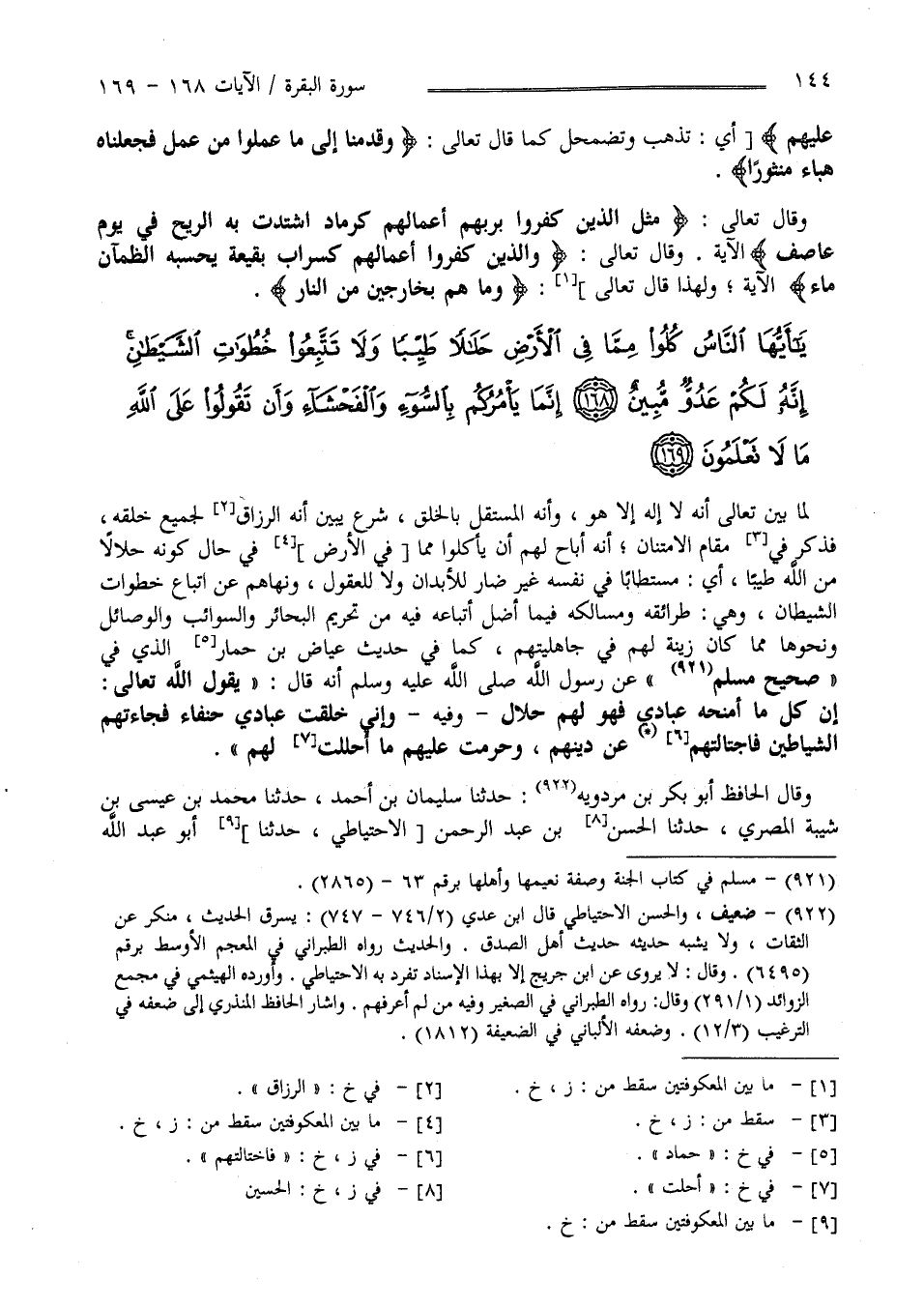 لَمَّا بَيَّنَ تَعَالَى أَنَّهُ لَا إِلَه إِلَّا هُوَ وَأَنَّهُ الْمُسْتَقِلّ بِالْخَلْقِ شَرَعَ يُبَيِّن أَنَّهُ الرَّزَّاق لِجَمِيعِ خَلْقه فَذَكَرَ فِي مَقَام الِامْتِنَان أَنَّهُ أَبَاحَ لَهُمْ أَنْ يَأْكُلُوا مِمَّا فِي الْأَرْض فِي حَال كَوْنه حَلَالًا مِنْ اللَّه طَيِّبًا أَيْ مُسْتَطَابًا فِي نَفْسه غَيْر ضَارٍ لِلْأَبْدَانِ وَلَا لِلْعُقُولِ وَنَهَاهُمْ عَنْ اِتِّبَاع خُطُوَات الشَّيْطَان وَهِيَ طَرَائِقه وَمَسَالِكه فِيمَا أَضَلَّ أَتْبَاعه فِيهِ مِنْ تَحْرِيم الْبَحَائِر وَالسَّوَائِب وَالْوَصَائِل وَنَحْوهَا مِمَّا كَانَ زِينَة لَهُمْ فِي جَاهِلِيَّتهمْ كَمَا فِي حَدِيث عِيَاض بْن حِمَار الَّذِي فِي صَحِيح مُسْلِم عَنْ رَسُول اللَّه صَلَّى اللَّه عَلَيْهِ وَسَلَّمَ أَنَّهُ قَالَ " يَقُول اللَّه تَعَالَى إِنَّ كُلّ مَال مَنَحْته عِبَادِي فَهُوَ لَهُمْ حَلَال - وَفِيهِ - وَإِنِّي خَلَقْت عِبَادِي حُنَفَاء فَجَاءَتْهُمْ الشَّيَاطِين فَاجْتَالَتْهُمْ عَنْ دِينهمْ وَحَرَّمَتْ عَلَيْهِمْ مَا أَحْلَلْت لَهُمْ " وَقَالَ الْحَافِظ أَبُو بَكْر بْن مَرْدَوَيْهِ : حَدَّثَنَا سُلَيْمَان بْن أَحْمَد حَدَّثَنَا مُحَمَّد بْن عِيسَى بْن شَيْبَة الْمِصْرِيّ حَدَّثَنَا الْمِصْرِيّ بْن عَبْد الرَّحْمَن الِاحْتِيَاطِيّ حَدَّثَنَا أَبُو عَبْد اللَّه