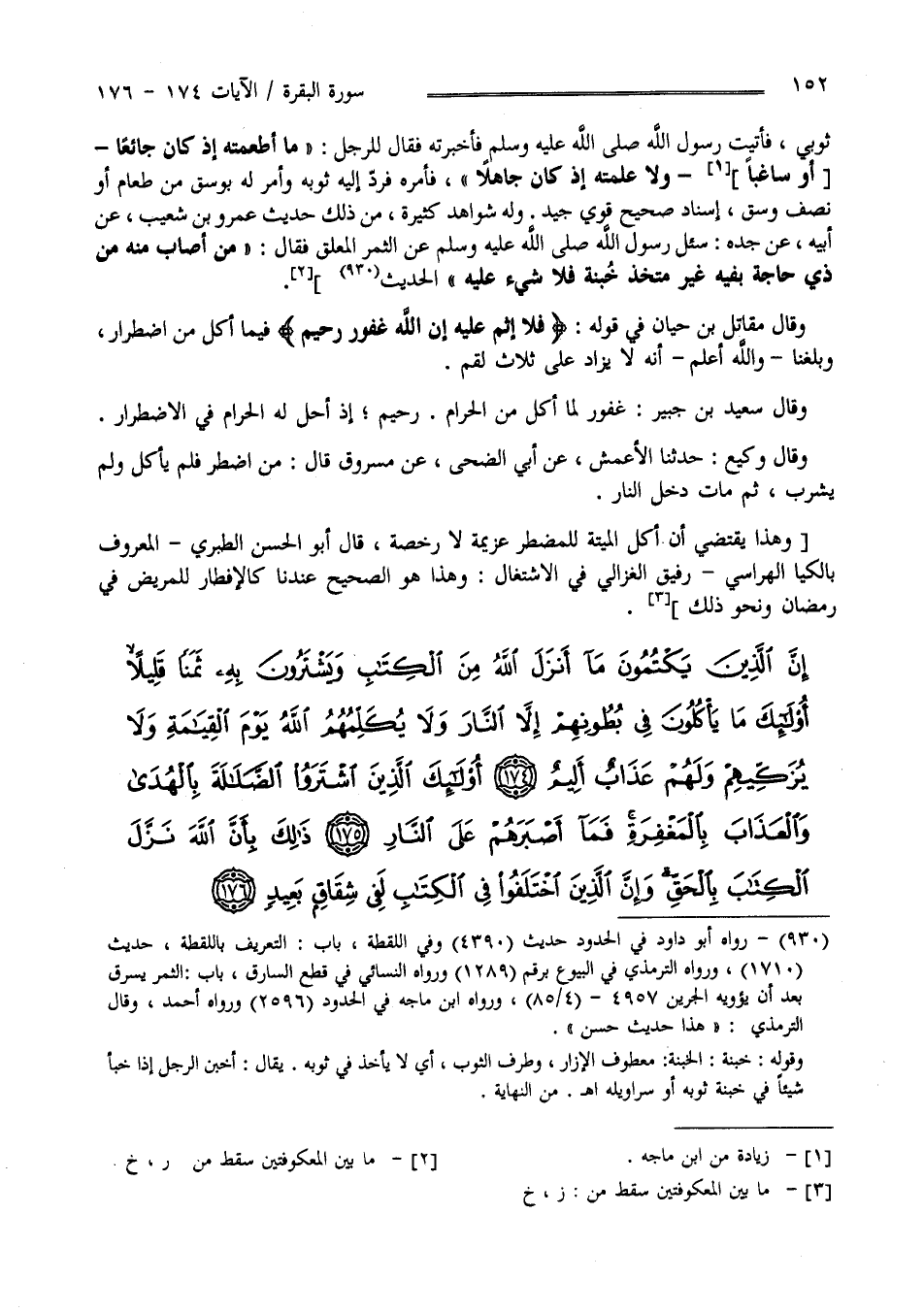 ثَوْبِي فَأَتَيْت رَسُول اللَّه صَلَّى اللَّه عَلَيْهِ وَسَلَّمَ فَأَخْبَرْته فَقَالَ لِلرَّجُلِ " مَا أَطْعَمْته إِذْ كَانَ جَائِعًا وَلَا عَلَّمْته إِذْ كَانَ جَاهِلًا " فَأَمَرَهُ فَرَدَّ إِلَيْهِ ثَوْبه وَأَمَرَ لَهُ بِوَسْقٍ مِنْ طَعَام أَوْ نِصْف وَسْق إِسْنَادٌ صَحِيحٌ قَوِيٌّ جَيِّدٌ وَلَهُ شَوَاهِد كَثِيرَة مِنْ ذَلِكَ حَدِيث عَمْرو بْن شُعَيْب عَنْ أَبِيهِ عَنْ جَدّه سُئِلَ رَسُول اللَّه صَلَّى اللَّه عَلَيْهِ وَسَلَّمَ عَنْ الثَّمَر الْمُعَلَّق فَقَالَ " مَنْ أَصَابَ مِنْهُ مِنْ ذِي حَاجَة بِفِيهِ غَيْر مُتَّخِذٍ خُبْنَةً فَلَا شَيْء عَلَيْهِ" الْحَدِيث : وَقَالَ مُقَاتِل بْن حَيَّان فِي قَوْله " فَلَا إِثْمَ عَلَيْهِ إِنَّ اللَّه غَفُور " فِيمَا أَكَلَ مِنْ اِضْطِرَار وَبَلَغْنَا وَاَللَّهُ أَعْلَمُ أَنَّهُ لَا يُزَاد عَلَى ثَلَاث لُقَم وَقَالَ سَعِيد بْن جُبَيْر : غَفُور لِمَا أَكَلَ مِنْ الْحَرَام رَحِيم إِذْ أَحَلَّ لَهُ الْحَرَام فِي الِاضْطِرَار وَقَالَ وَكِيع أَخْبَرَنَا الْأَعْمَش عَنْ أَبِي الضُّحَى عَنْ مَسْرُوق قَالَ : مَنْ اُضْطُرَّ فَلَمْ يَأْكُل وَلَمْ يَشْرَب ثُمَّ مَاتَ دَخَلَ النَّار وَهَذَا يَقْتَضِي أَنَّ أَكْلَ الْمَيْتَة لِلْمُضْطَرِّ عَزِيمَة لَا رُخْصَة قَالَ أَبُو الْحَسَن الطَّبَرِيّ : الْمَعْرُوف بِإِلْكِيَا الْهَرَّاسِيّ رَفِيق الْغَزَالِيّ فِي الِاشْتِغَال وَهَذَا هُوَ الصَّحِيح عِنْدنَا كَالْإِفْطَارِ لِلْمَرِيضِ وَنَحْو ذَلِكَ .