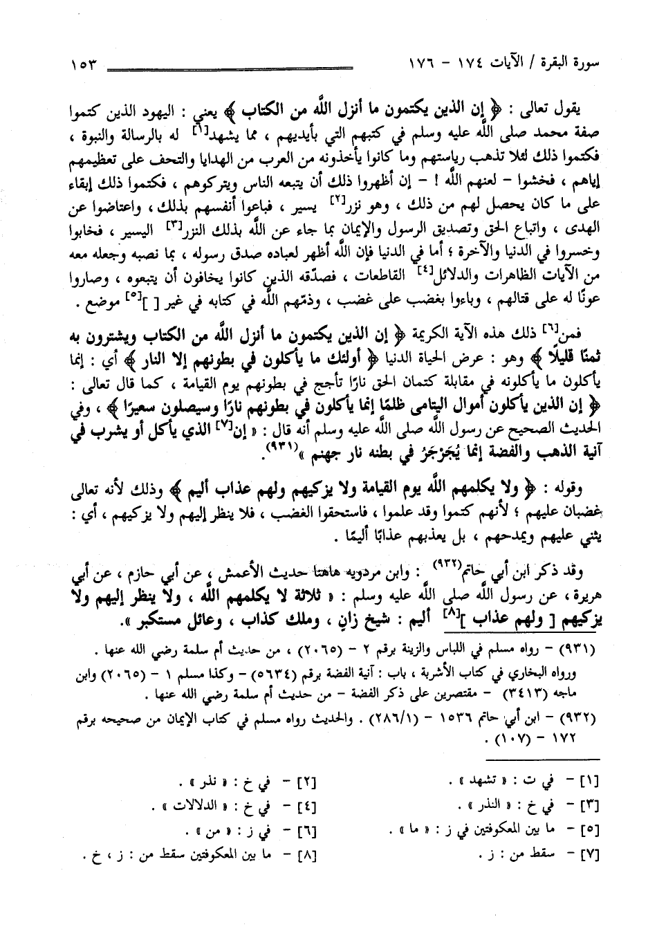 يَقُول تَعَالَى " إِنَّ الَّذِينَ يَكْتُمُونَ مَا أَنْزَلَ اللَّه مِنْ الْكِتَاب " يَعْنِي الْيَهُود الَّذِينَ كَتَمُوا صِفَة مُحَمَّد صَلَّى اللَّه عَلَيْهِ وَسَلَّمَ فِي كُتُبهمْ الَّتِي بِأَيْدِيهِمْ مِمَّا تَشْهَد لَهُ بِالرِّسَالَةِ وَالنُّبُوَّة فَكَتَمُوا ذَلِكَ لِئَلَّا تَذْهَب رِيَاسَتهمْ وَمَا كَانُوا يَأْخُذُونَهُ مِنْ الْعَرَب مِنْ الْهَدَايَا وَالتُّحَف عَلَى تَعْظِيمهمْ آبَاءَهُمْ فَخَشَوْا لَعَنَهُمْ اللَّه إِنْ أَظْهَرُوا ذَلِكَ أَنْ يَتَّبِعهُ النَّاس وَيَتْرُكُوهُمْ فَكَتَمُوا ذَلِكَ عَلَى إِبْقَاء عَلَى مَا كَانَ يَحْصُل لَهُمْ مِنْ ذَلِكَ وَهُوَ نَزْرٌ يَسِيرٌ فَبَاعُوا أَنْفُسهمْ بِذَلِكَ وَاعْتَاضُوا عَنْ الْهُدَى وَاتِّبَاع الْحَقّ وَتَصْدِيق الرَّسُول وَالْإِيمَان بِمَا جَاءَ عَنْ اللَّه بِذَلِكَ النَّزْر الْيَسِير فَخَابُوا وَخَسِرُوا فِي الدُّنْيَا وَالْآخِرَة أَمَّا فِي الدُّنْيَا فَإِنَّ اللَّهَ أَظْهَرَ لِعِبَادِهِ صِدْق رَسُوله بِمَا نَصَبَهُ وَجَعَلَهُ مَعَهُ مِنْ الْآيَات الظَّاهِرَات وَالدَّلَائِل الْقَاطِعَات فَصَدَّقَهُ الَّذِينَ كَانُوا يَخَافُونَ أَنْ يَتَّبِعُوهُ وَصَارُوا عَوْنًا لَهُ عَلَى قِتَالهمْ وَبَاءُوا بِغَضَبٍ عَلَى غَضَب وَذَمَّهُمْ اللَّهُ فِي كِتَابه فِي غَيْر مَوْضِع فَمِنْ ذَلِكَ هَذِهِ الْآيَة الْكَرِيمَة " إِنَّ الَّذِينَ يَكْتُمُونَ مَا أَنْزَلَ اللَّهُ مِنْ الْكِتَاب وَيَشْتَرُونَ بِهِ ثَمَنًا قَلِيلًا " وَهُوَ عَرَض الْحَيَاة الدُّنْيَا وَأُولَئِكَ مَا يَأْكُلُونَ فِي بُطُونهمْ إِلَّا النَّار أَيْ إِنَّمَا يَأْكُلُونَ مَا يَأْكُلُونَهُ فِي مُقَابَلَة كِتْمَان الْحَقّ نَارًا تَأَجَّجَ فِي بُطُونهمْ يَوْم الْقِيَامَة كَمَا قَالَ تَعَالَى " إِنَّ الَّذِينَ يَأْكُلُونَ أَمْوَالَ الْيَتَامَى ظُلْمًا إِنَّمَا يَأْكُلُونَ فِي بُطُونِهِمْ نَارًا وَسَيَصْلَوْنَ سَعِيرًا " وَفِي الْحَدِيث الصَّحِيح عَنْ رَسُول اللَّه صَلَّى اللَّه عَلَيْهِ وَسَلَّمَ أَنَّهُ قَالَ " إِنَّ الَّذِي يَأْكُل أَوْ يَشْرَب فِي آنِيَة الذَّهَب وَالْفِضَّة إِنَّمَا يُجَرْجِر فِي بَطْنه نَار جَهَنَّم " وَقَوْله " وَلَا يُكَلِّمُهُمْ اللَّهُ يَوْمَ الْقِيَامَةِ وَلَا يُزَكِّيهِمْ وَلَهُمْ عَذَابٌ أَلِيمٌ " وَذَلِكَ لِأَنَّهُ تَعَالَى غَضْبَان عَلَيْهِمْ لِأَنَّهُمْ كَتَمُوا وَقَدْ عَلِمُوا فَاسْتَحَقُّوا الْغَضَب فَلَا يَنْظُر إِلَيْهِمْ وَلَا يُزَكِّيهِمْ أَيْ يُثْنِي عَلَيْهِمْ وَيَمْدَحهُمْ بَلْ يُعَذِّبهُمْ عَذَابًا أَلِيمًا وَقَدْ ذَكَرَ اِبْن أَبِي حَاتِم وَابْن مَرْدَوَيْهِ هَاهُنَا حَدِيث الْأَعْمَش عَنْ أَبِي حَازِم عَنْ أَبِي هُرَيْرَة عَنْ رَسُول اللَّه صَلَّى اللَّه عَلَيْهِ وَسَلَّمَ " ثَلَاثَةٌ لَا يُكَلِّمهُمْ اللَّه وَلَا يَنْظُر إِلَيْهِمْ وَلَا يُزَكِّيهِمْ وَلَهُمْ عَذَاب أَلِيم شَيْخ زَانٍ وَمَلِكٌ كَذَّابٌ وَعَائِلٌ مُسْتَكْبِرٌ "
