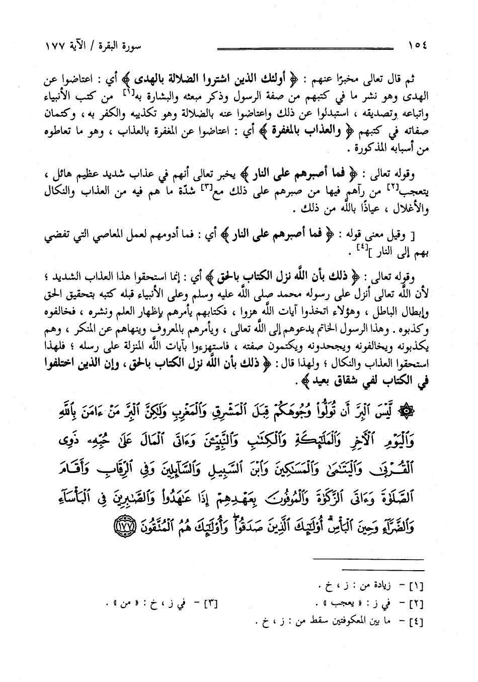 لَيْسَ الْبِرَّ أَنْ تُوَلُّوا وُجُوهَكُمْ قِبَلَ الْمَشْرِقِ وَالْمَغْرِبِ وَلَكِنَّ الْبِرَّ مَنْ آمَنَ بِاللَّهِ وَالْيَوْمِ الْآخِرِ وَالْمَلَائِكَةِ وَالْكِتَابِ وَالنَّبِيِّينَ وَآتَى الْمَالَ عَلَى حُبِّهِ ذَوِي الْقُرْبَى وَالْيَتَامَى وَالْمَسَاكِينَ وَابْنَ السَّبِيلِ وَالسَّائِلِينَ وَفِي الرِّقَابِ وَأَقَامَ الصَّلَاةَ وَآتَى الزَّكَاةَ وَالْمُوفُونَ بِعَهْدِهِمْ إِذَا عَاهَدُوا وَالصَّابِرِينَ فِي الْبَأْسَاءِ وَالضَّرَّاءِ وَحِينَ الْبَأْسِ أُولَئِكَ الَّذِينَ صَدَقُوا وَأُولَئِكَ هُمُ الْمُتَّقُونَ