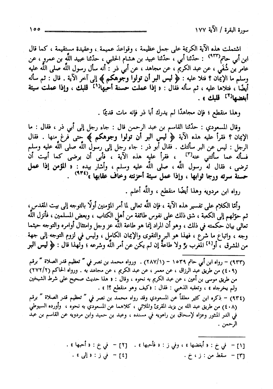 اِشْتَمَلَتْ هَذِهِ الْآيَة الْكَرِيمَة عَلَى جُمَلٍ عَظِيمَةٍ وَقَوَاعِدَ عَمِيمَةٍ وَعَقِيدَةٍ مُسْتَقِيمَةٍ كَمَا قَالَ اِبْن أَبِي حَاتِم حَدَّثَنَا أَبِي حَدَّثَنَا عُبَيْد بْن هِشَام الْحَلَبِيّ حَدَّثَنَا عُبَيْد اللَّه بْن عَمْرو عَنْ عَامِر بْن شُفَيّ عَنْ عَبْد الْكَرِيم عَنْ مُجَاهِد عَنْ أَبِي ذَرّ أَنَّهُ سَأَلَ رَسُول اللَّه صَلَّى اللَّه عَلَيْهِ وَسَلَّمَ مَا الْإِيمَانُ ؟ فَتَلَا عَلَيْهِ " لَيْسَ الْبِرَّ أَنْ تُوَلُّوا وُجُوهَكُمْ " إِلَى آخِر الْآيَة قَالَ : ثُمَّ سَأَلَهُ أَيْضًا فَتَلَاهَا عَلَيْهِ ثُمَّ سَأَلَهُ فَقَالَ : " إِذَا عَمِلْت حَسَنَة أَحَبَّهَا قَلْبك وَإِذَا عَمِلْت سَيِّئَة أَبْغَضَهَا قَلْبك " وَهَذَا مُنْقَطِع فَإِنَّ مُجَاهِدًا لَمْ يُدْرِك أَبَا ذَرّ فَإِنَّهُ مَاتَ قَدِيمًا وَقَالَ الْمَسْعُودِيّ : حَدَّثَنَا الْقَاسِم بْن عَبْد الرَّحْمَن قَالَ جَاءَ رَجُل إِلَى أَبِي ذَرّ فَقَالَ مَا الْإِيمَان ؟ فَقَرَأَ عَلَيْهِ هَذِهِ الْآيَة " لَيْسَ الْبِرَّ أَنْ تُوَلُّوا وُجُوهَكُمْ " حَتَّى فَرَغَ مِنْهَا فَقَالَ الرَّجُل لَيْسَ عَنْ الْبِرّ سَأَلْتُك فَقَالَ أَبُو ذَرّ : جَاءَ رَجُل إِلَى رَسُول اللَّه صَلَّى اللَّه عَلَيْهِ وَسَلَّمَ فَسَأَلَهُ عَمَّا سَأَلْتنِي عَنْهُ فَقَرَأَ عَلَيْهِ هَذِهِ الْآيَة فَأَبَى أَنْ يَرْضَى كَمَا أَبَيْت أَنْ تَرْضَى فَقَالَ لَهُ رَسُول اللَّه صَلَّى اللَّه عَلَيْهِ وَسَلَّمَ وَأَشَارَ بِيَدِهِ " الْمُؤْمِنُ إِذَا عَمِلَ حَسَنَةً سَرَّتْهُ وَرَجَا ثَوَابَهَا وَإِذَا عَمِلَ سَيِّئَةً أَحْزَنَتْهُ وَخَافَ عِقَابَهَا" رَوَاهُ اِبْن مَرْدَوَيْهِ وَهَذَا أَيْضًا مُنْقَطِع وَاَللَّه أَعْلَم.